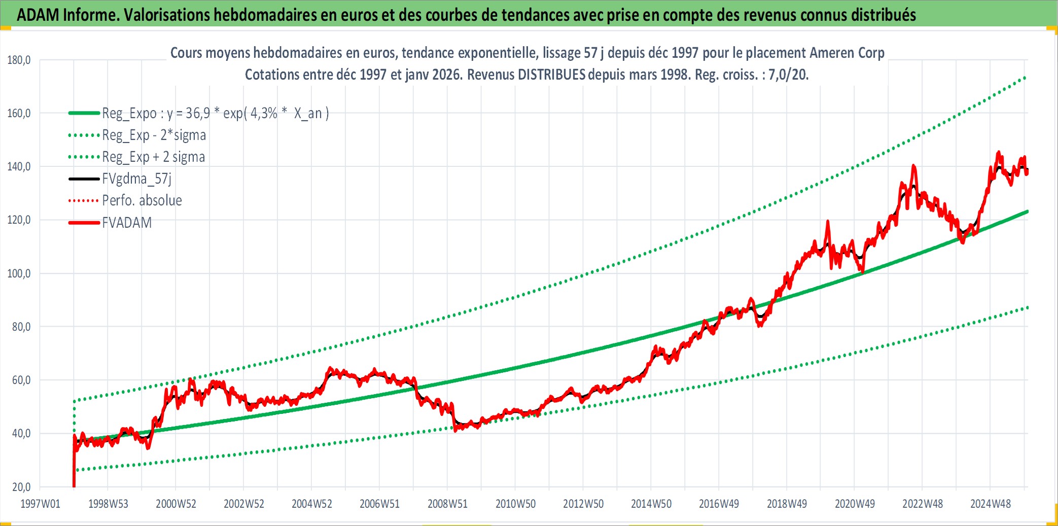 Site dédié aux investisseursPage dédiée sur site financeAnalyse des valorisations hebdomadaires de l'action Ameren Corp. Cet actif est cote en USD. Les valorisations sont en contrevaleur EURO et couvrent les semaines 1998W01 a 2026W01. Les revenus de cet actif financier sont pris en compte depuis la semaine 1998W10. La note globale ESG de cet actif est estimee a 5.0 (apres rebasage entre 0 et 20).