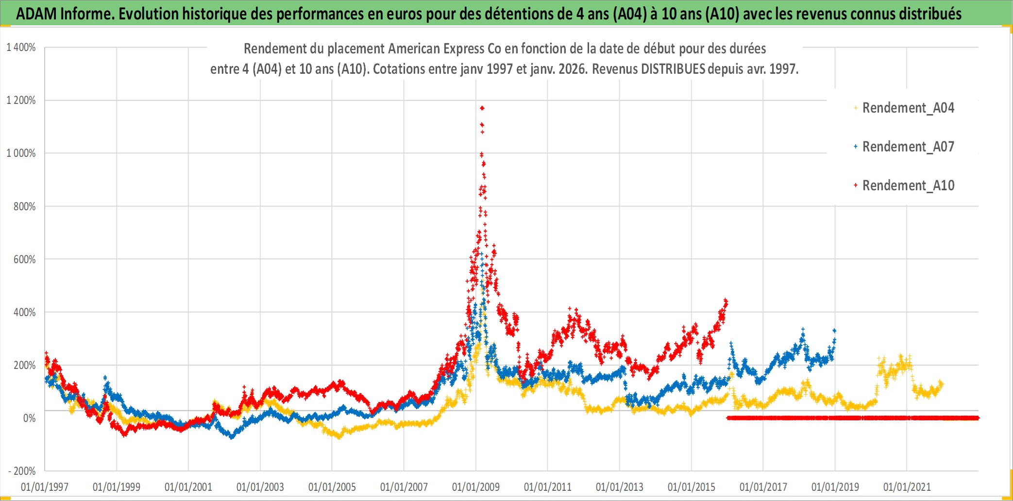 Site dédié aux investisseursPage dédiée sur site financeAnalyse des valorisations hebdomadaires de l'action American Express Co. Cet actif est cote en USD. Les valorisations sont en contrevaleur EURO et couvrent les semaines 1997W01 a 2026W01. Les revenus de cet actif financier sont pris en compte depuis la semaine 1997W14. La note globale ESG de cet actif est estimee a 11.0 (apres rebasage entre 0 et 20).