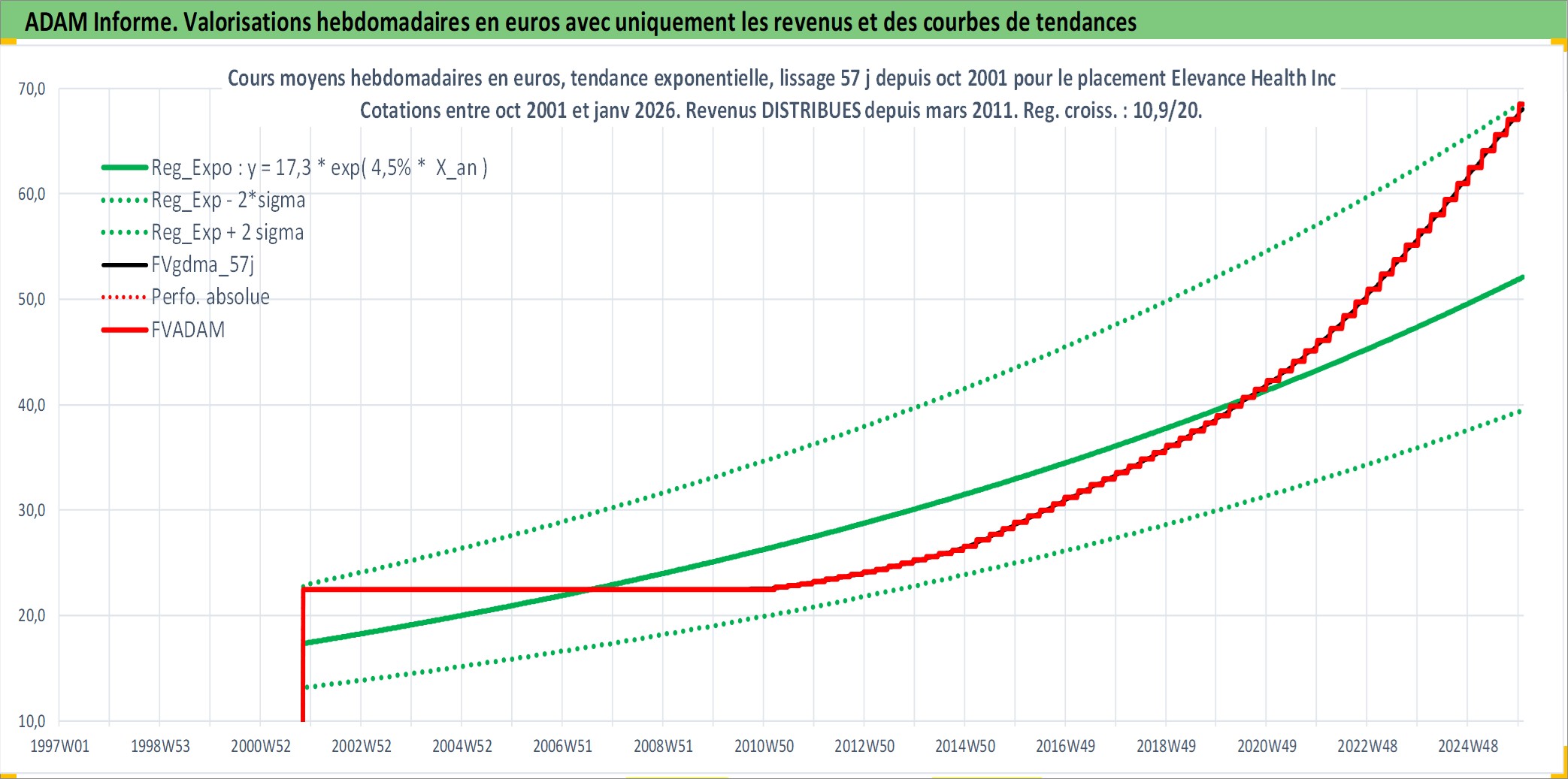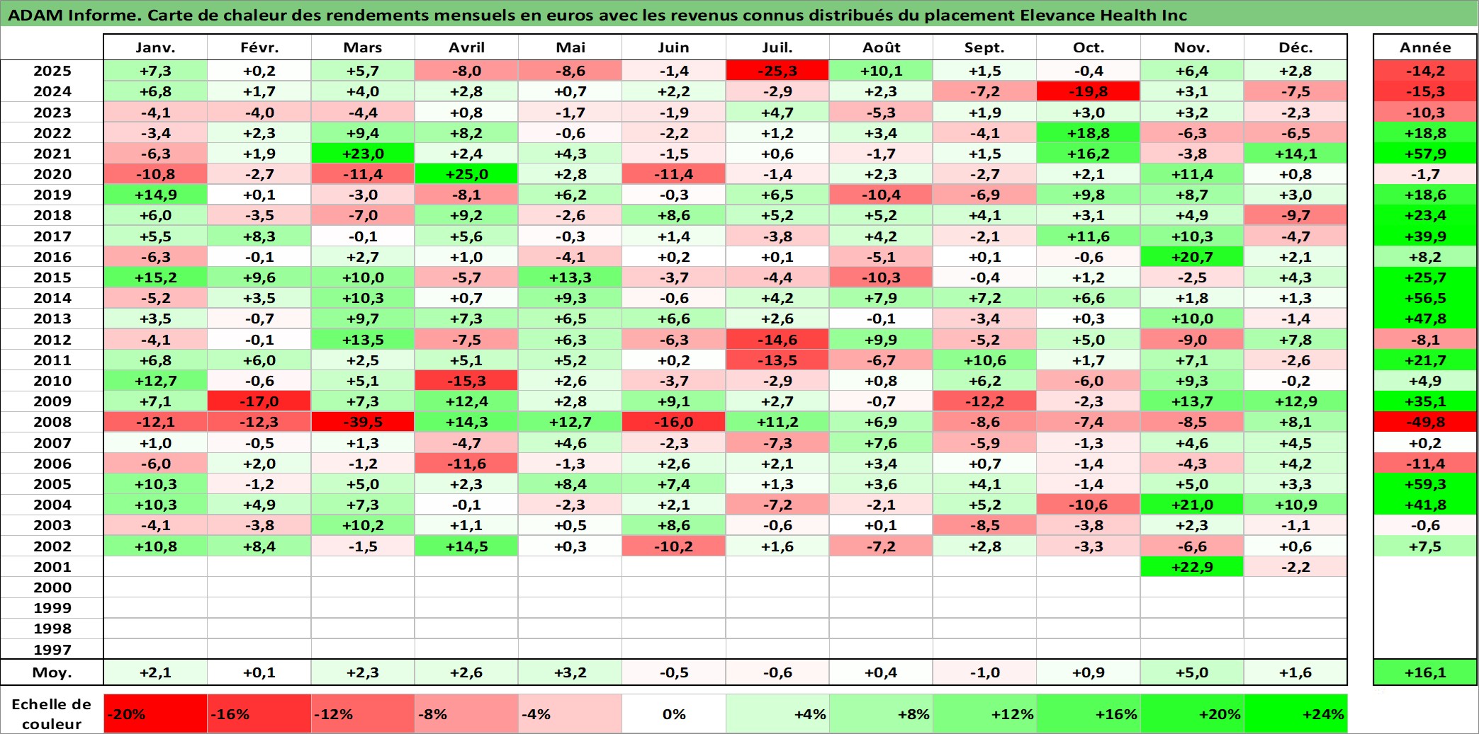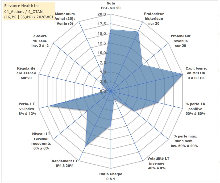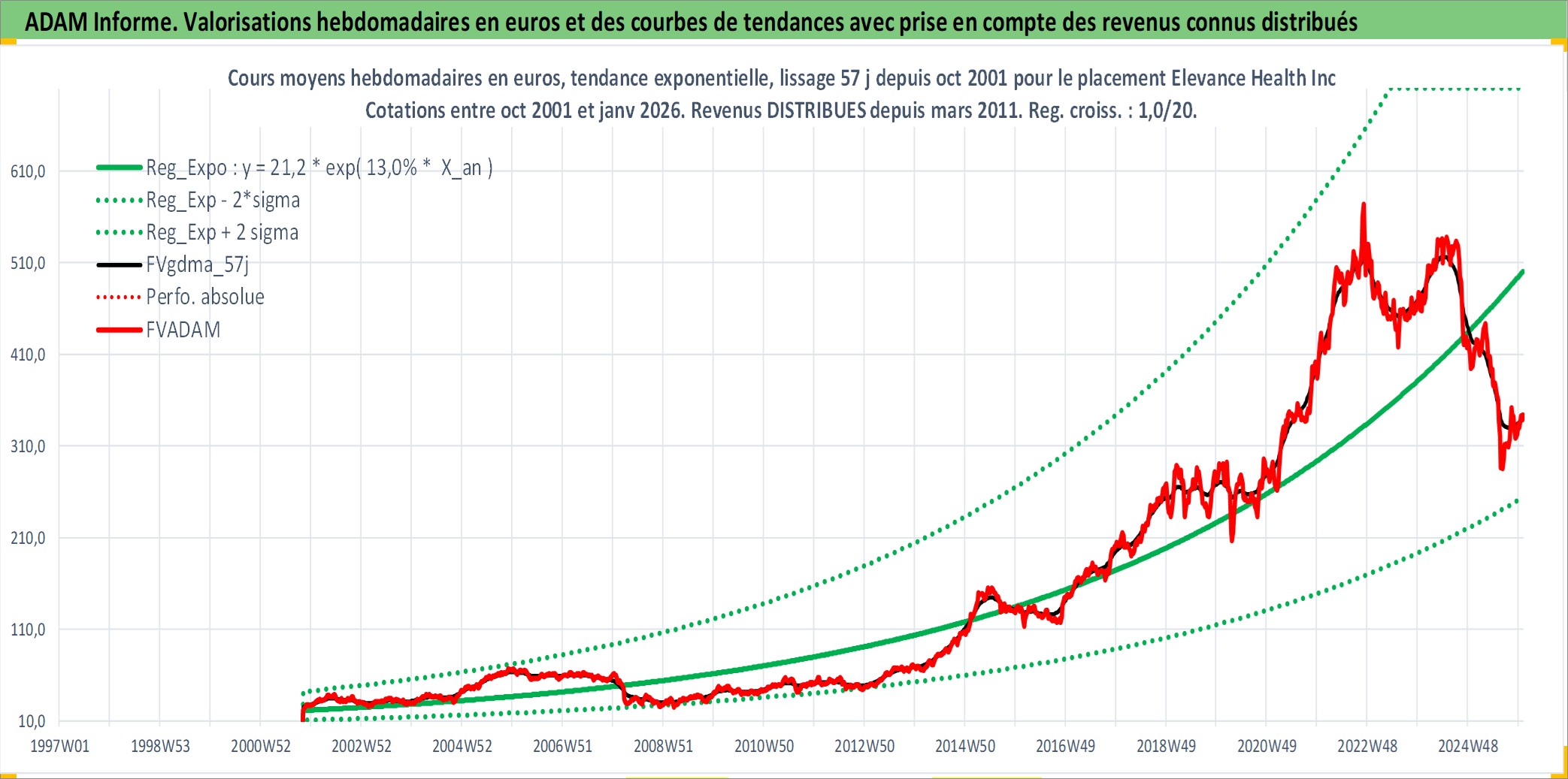Site dédié aux investisseursPage dédiée sur site financeAnalyse des valorisations hebdomadaires de l'action Elevance Health Inc. Cet actif est cote en USD. Les valorisations sont en contrevaleur EURO et couvrent les semaines 2001W44 a 2026W01. Les revenus de cet actif financier sont pris en compte depuis la semaine 2011W10. La note globale ESG de cet actif est estimee a 16.0 (apres rebasage entre 0 et 20).
