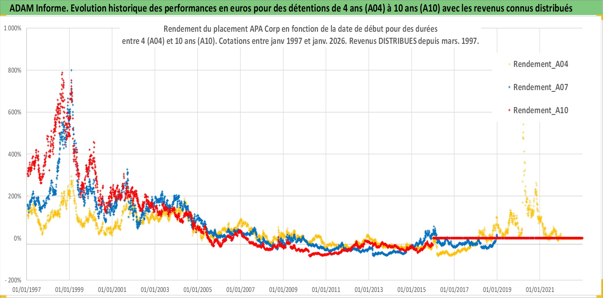 Site dédié aux investisseursPage dédiée sur site financeAnalyse des valorisations hebdomadaires de l'action APA Corp. Cet actif est cote en USD. Les valorisations sont en contrevaleur EURO et couvrent les semaines 1997W01 a 2026W01. Les revenus de cet actif financier sont pris en compte depuis la semaine 1997W13. La note globale ESG de cet actif est estimee a 2.0 (apres rebasage entre 0 et 20).
