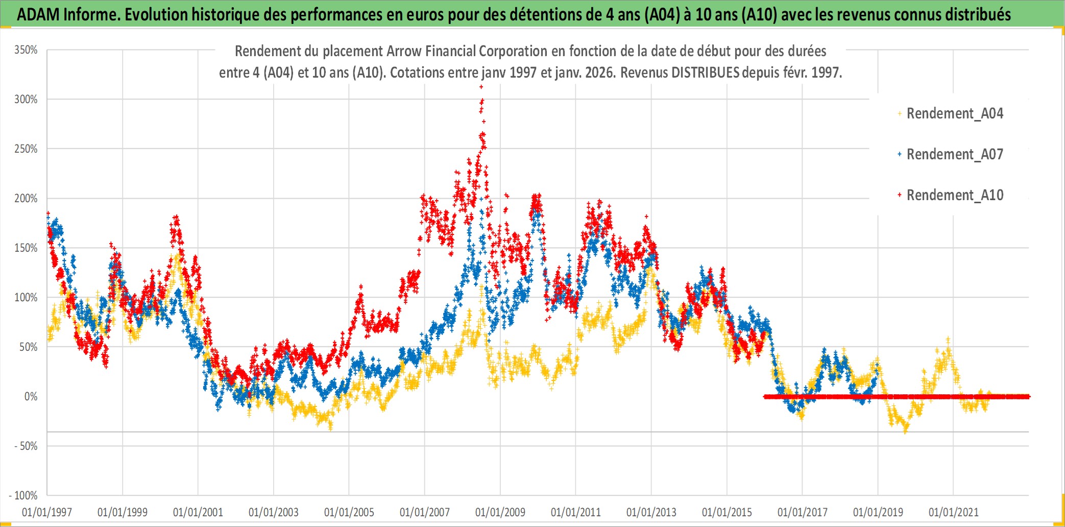 Site dédié aux investisseursPage dédiée sur site financeAnalyse des valorisations hebdomadaires de l'action Arrow Financial Corporation. Cet actif est cote en USD. Les valorisations sont en contrevaleur EURO et couvrent les semaines 1997W01 a 2026W01. Les revenus de cet actif financier sont pris en compte depuis la semaine 1997W09. La note ESG de cet actif n'est pas connue.