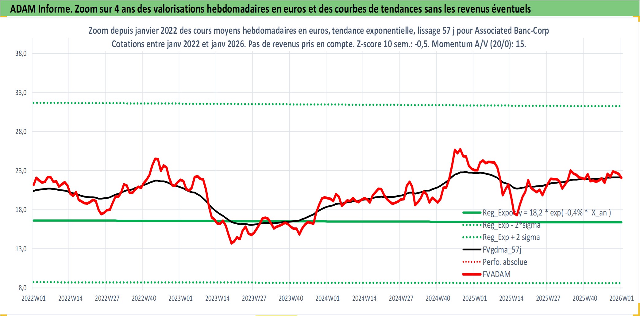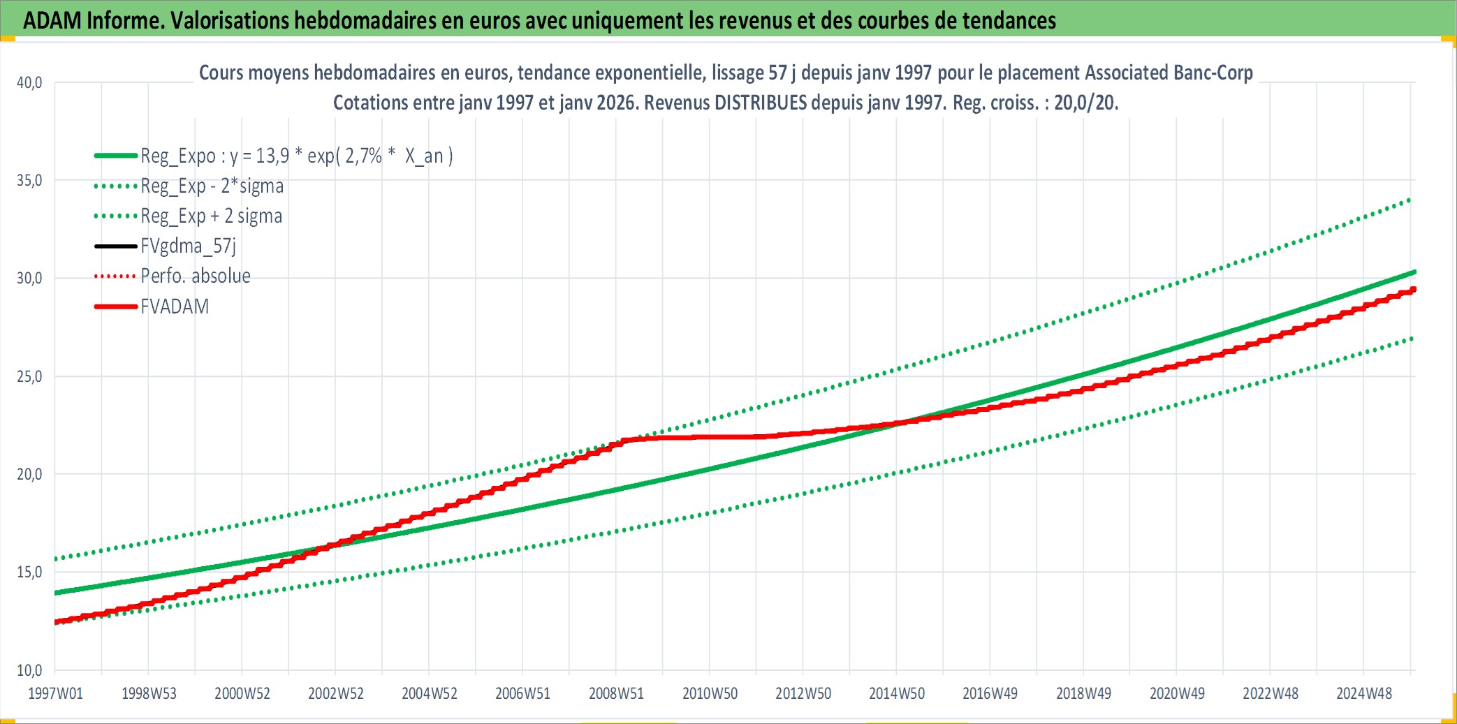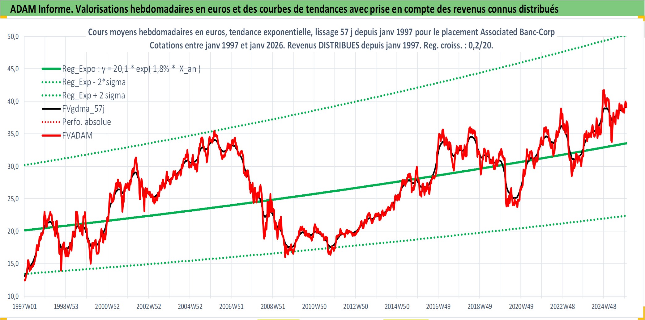 Site dédié aux investisseursPage dédiée sur site financeAnalyse des valorisations hebdomadaires de l'action Associated Banc-Corp. Cet actif est cote en USD. Les valorisations sont en contrevaleur EURO et couvrent les semaines 1997W01 a 2026W01. Les revenus de cet actif financier sont pris en compte depuis la semaine 1997W05. La note ESG de cet actif n'est pas connue.