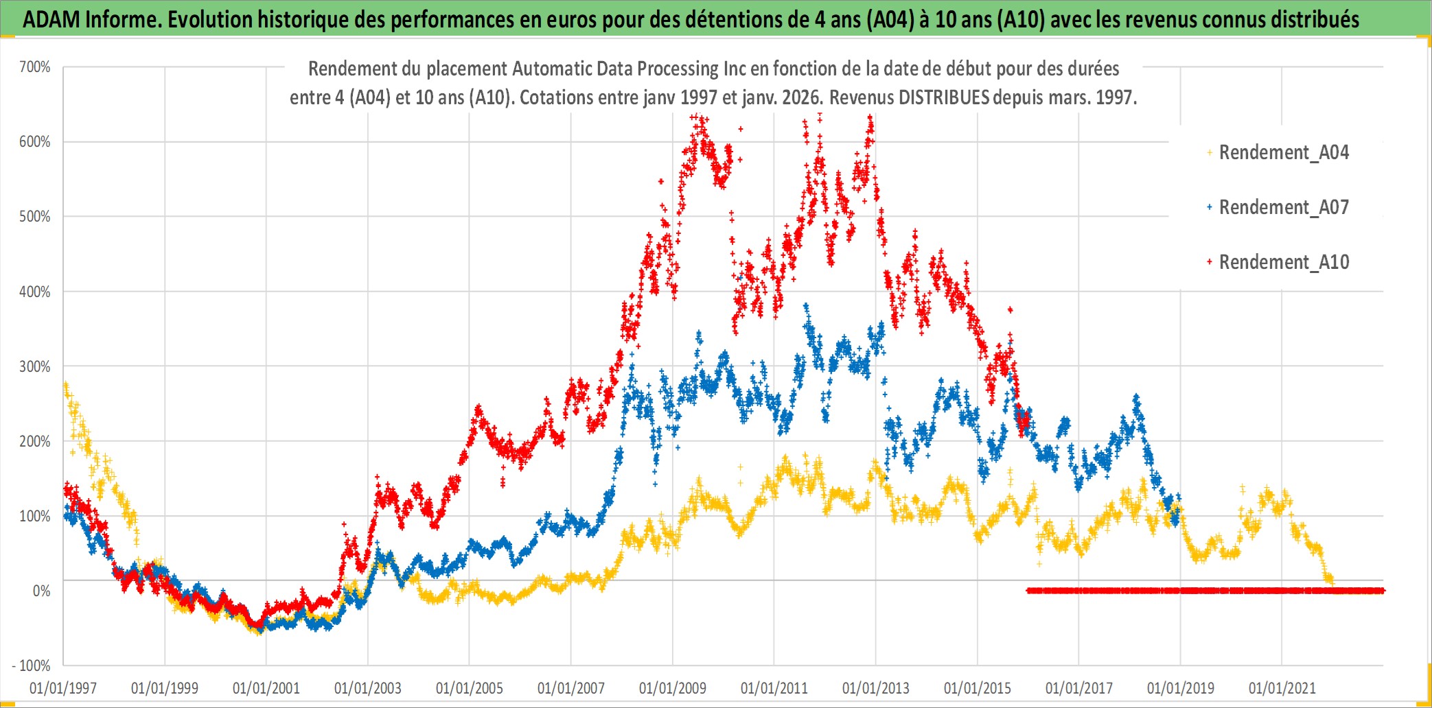 Site dédié aux investisseursPage dédiée sur site financeAnalyse des valorisations hebdomadaires de l'action Automatic Data Processing Inc. Cet actif est cote en USD. Les valorisations sont en contrevaleur EURO et couvrent les semaines 1997W01 a 2026W01. Les revenus de cet actif financier sont pris en compte depuis la semaine 1997W11. La note globale ESG de cet actif est estimee a 14.0 (apres rebasage entre 0 et 20).