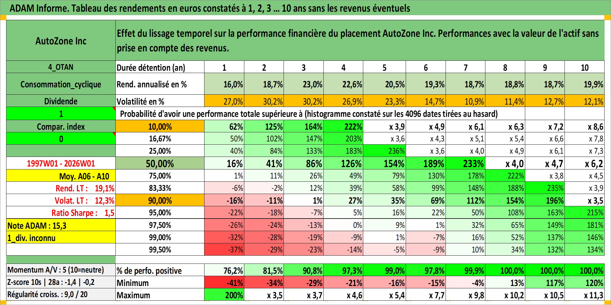 Site dédié aux investisseursPage dédiée sur site financeAnalyse des valorisations hebdomadaires de l'action AutoZone Inc. Cet actif est cote en USD. Les valorisations sont en contrevaleur EURO et couvrent les semaines 1997W01 a 2026W01. Les revenus de cet actif financier ne sont pas connus car non existants ou non disponibles sur le site Yahoo Finance. La note globale ESG de cet actif est estimee a 16.0 (apres rebasage entre 0 et 20).