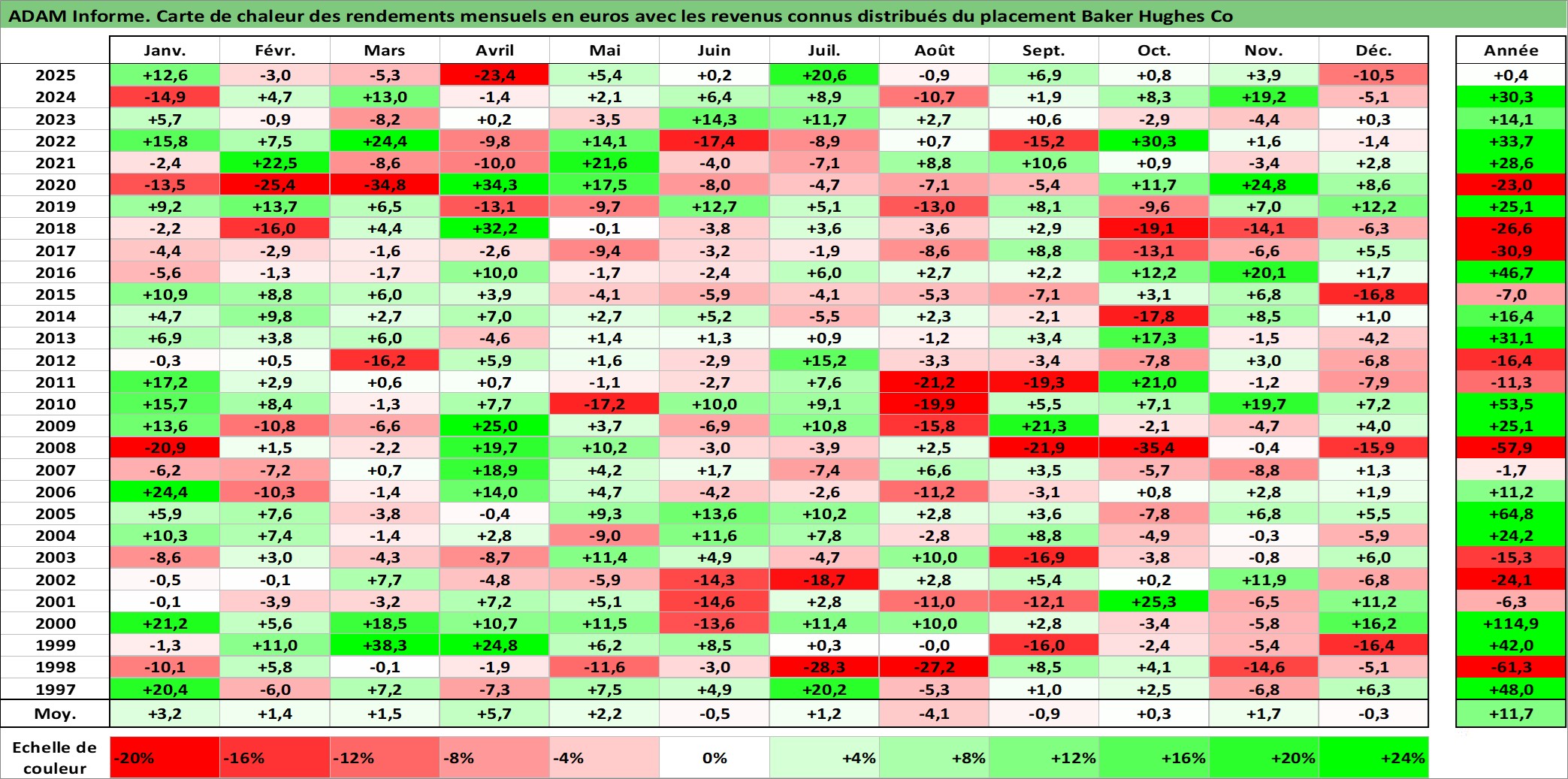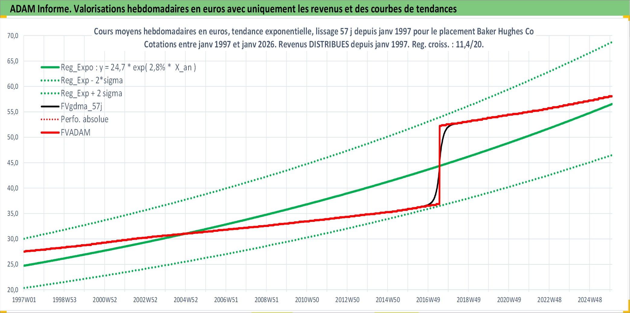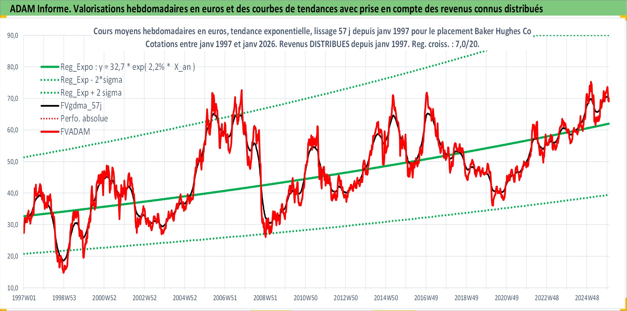 Site dédié aux investisseursPage dédiée sur site financeAnalyse des valorisations hebdomadaires de l'action Baker Hughes Co. Cet actif est cote en USD. Les valorisations sont en contrevaleur EURO et couvrent les semaines 1997W01 a 2026W01. Les revenus de cet actif financier sont pris en compte depuis la semaine 1997W05. La note ESG de cet actif n'est pas connue.