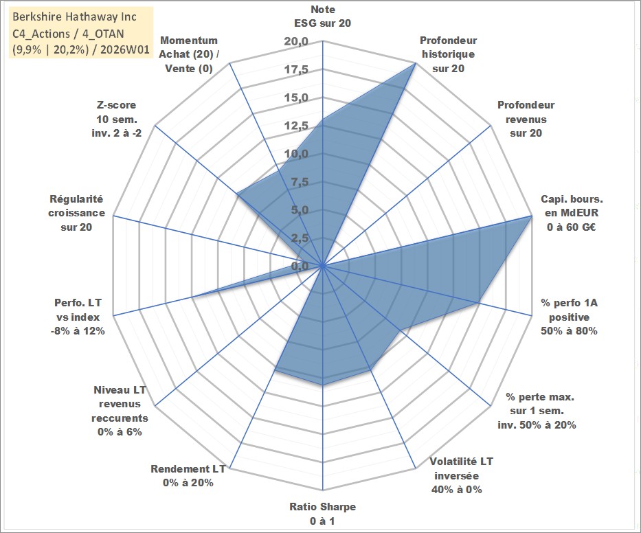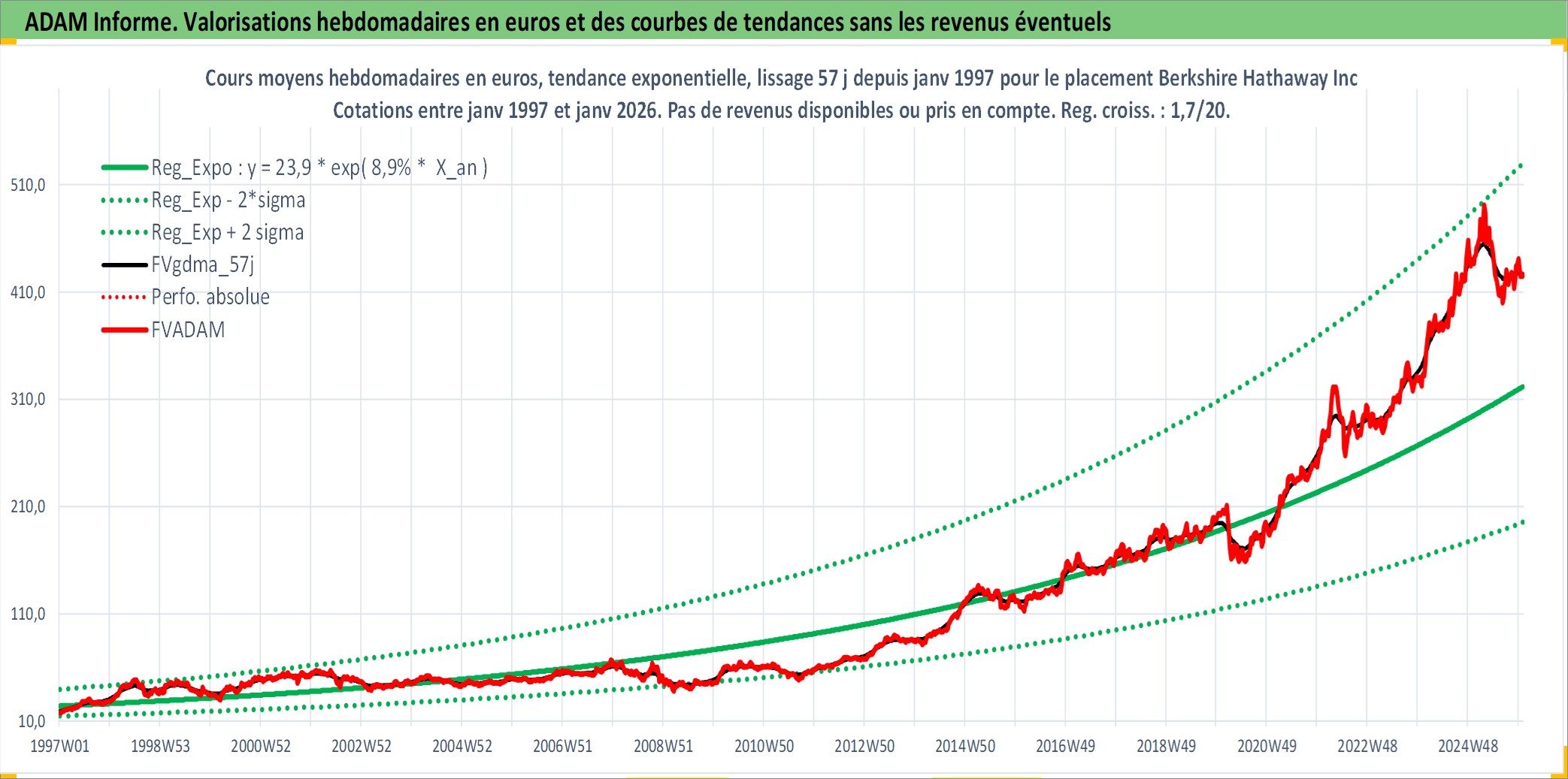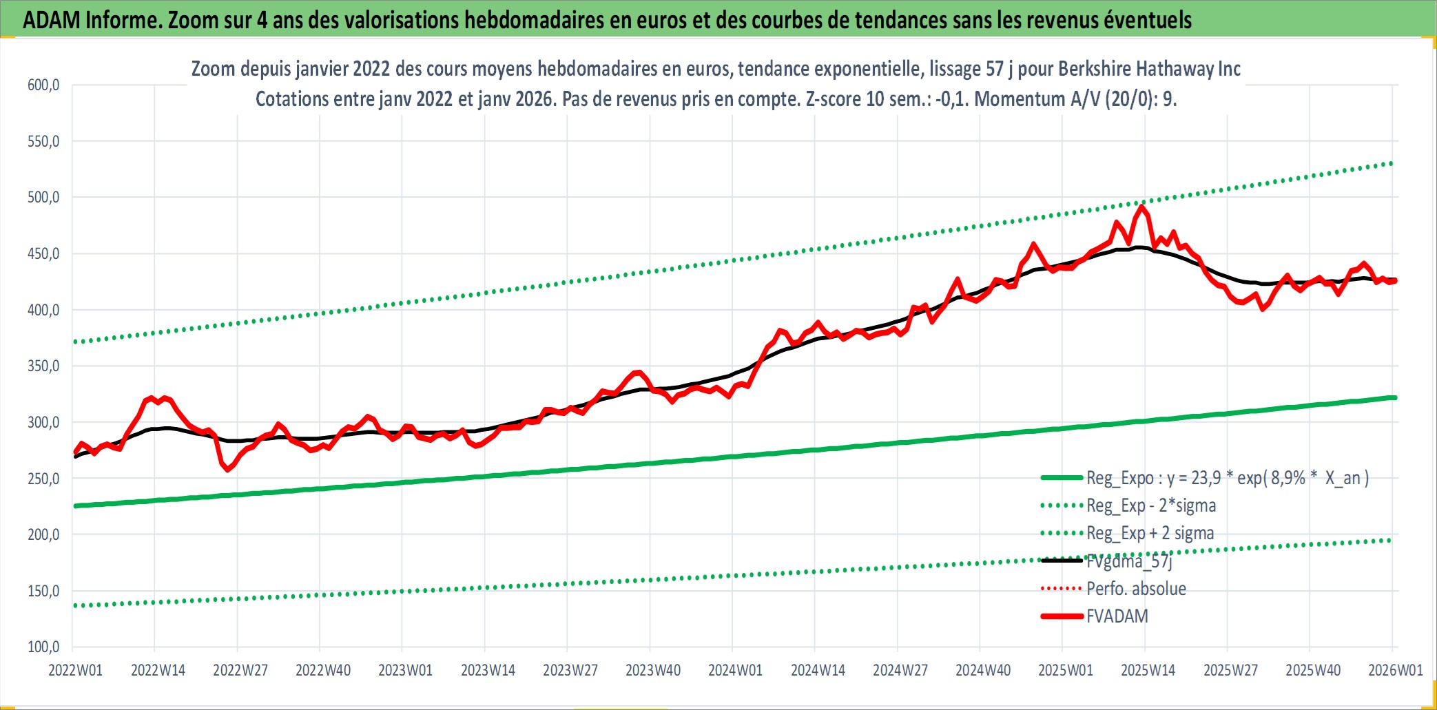 Site dédié aux investisseursPage dédiée sur site financeAnalyse des valorisations hebdomadaires de l'action Berkshire Hathaway Inc. Cet actif est cote en USD. Les valorisations sont en contrevaleur EURO et couvrent les semaines 1997W01 a 2026W01. Les revenus de cet actif financier ne sont pas connus car non existants ou non disponibles sur le site Yahoo Finance. La note globale ESG de cet actif est estimee a 13.0 (apres rebasage entre 0 et 20).