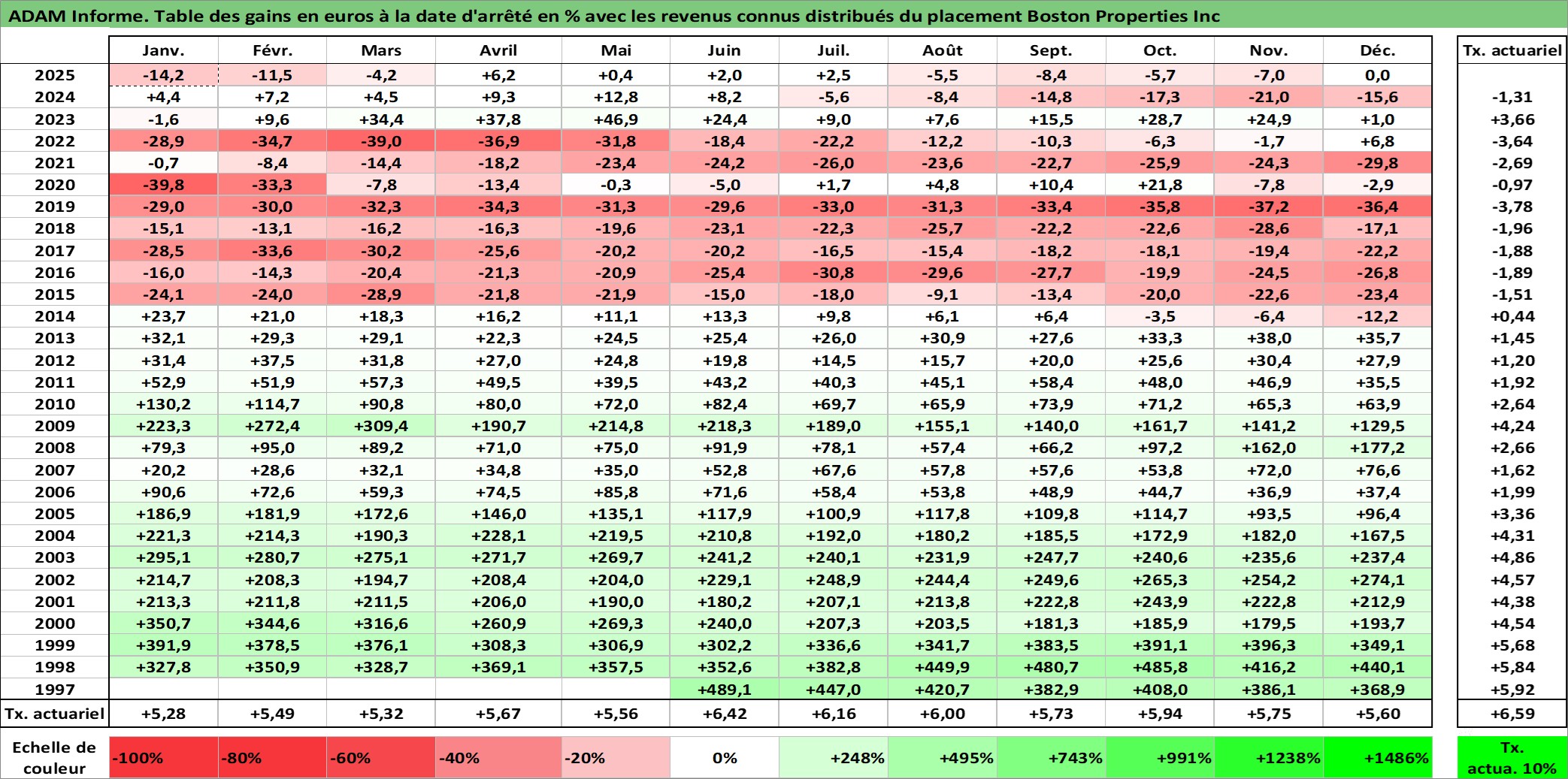 Site dédié aux investisseursPage dédiée sur site financeAnalyse des valorisations hebdomadaires de l'action Boston Properties Inc. Cet actif est cote en USD. Les valorisations sont en contrevaleur EURO et couvrent les semaines 1997W25 a 2026W01. Les revenus de cet actif financier sont pris en compte depuis la semaine 1997W45. La note globale ESG de cet actif est estimee a 15.0 (apres rebasage entre 0 et 20).
