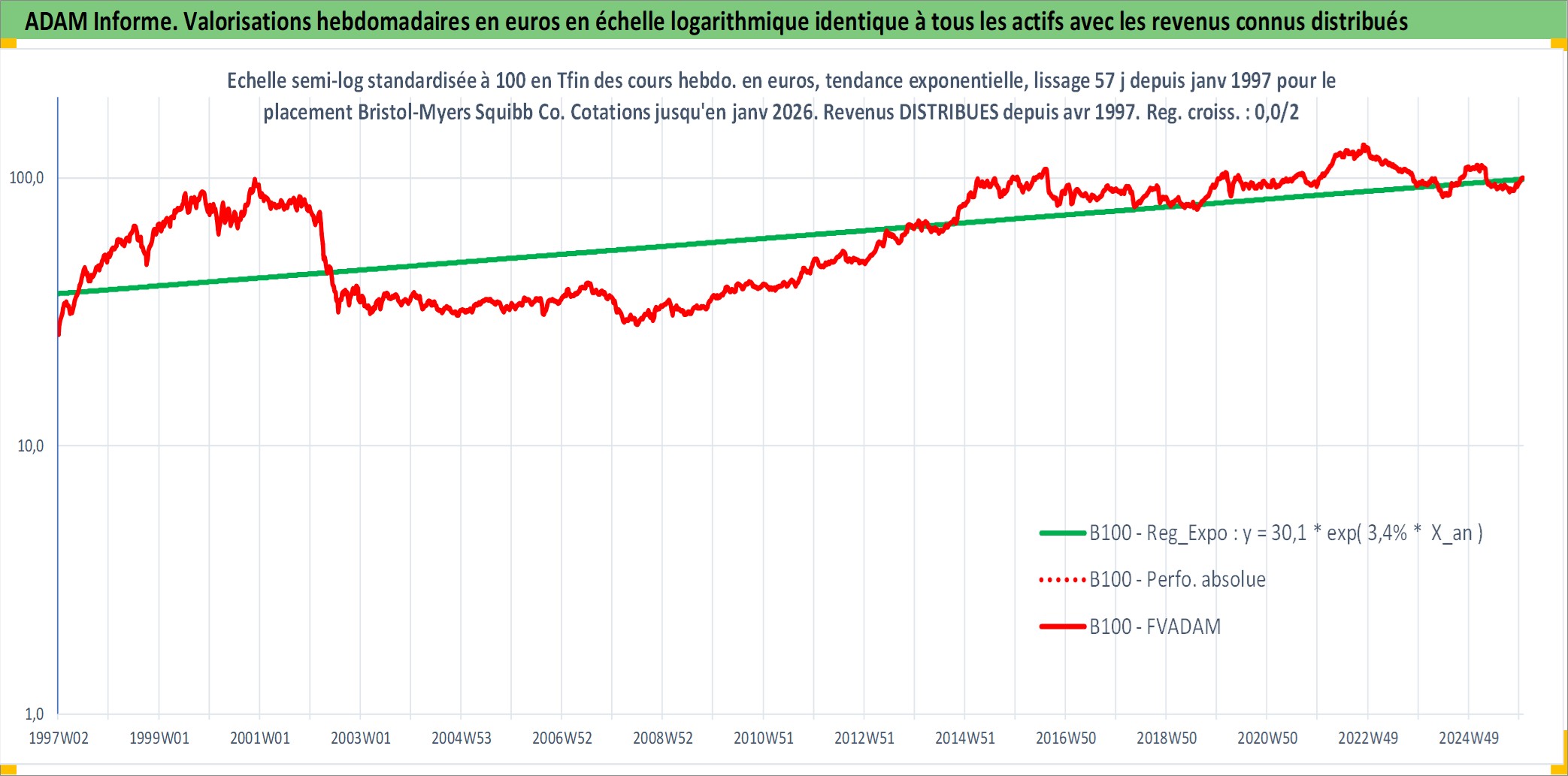 Site dédié aux investisseursPage dédiée sur site financeAnalyse des valorisations hebdomadaires de l'action Bristol-Myers Squibb Co. Cet actif est cote en USD. Les valorisations sont en contrevaleur EURO et couvrent les semaines 1997W01 a 2026W01. Les revenus de cet actif financier sont pris en compte depuis la semaine 1997W14. La note globale ESG de cet actif est estimee a 9.0 (apres rebasage entre 0 et 20).