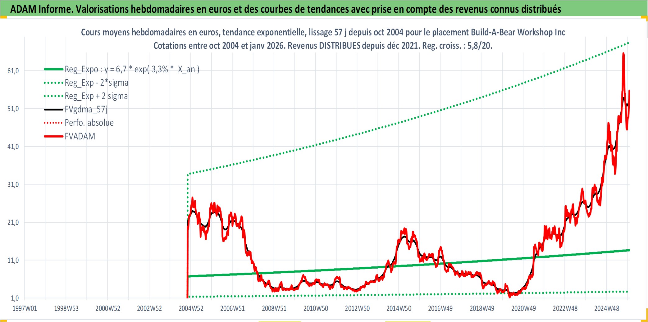Site dédié aux investisseursPage dédiée sur site financeAnalyse des valorisations hebdomadaires de l'action Build-A-Bear Workshop Inc. Cet actif est cote en USD. Les valorisations sont en contrevaleur EURO et couvrent les semaines 2004W44 a 2026W01. Les revenus de cet actif financier sont pris en compte depuis la semaine 2021W49. La note ESG de cet actif n'est pas connue.