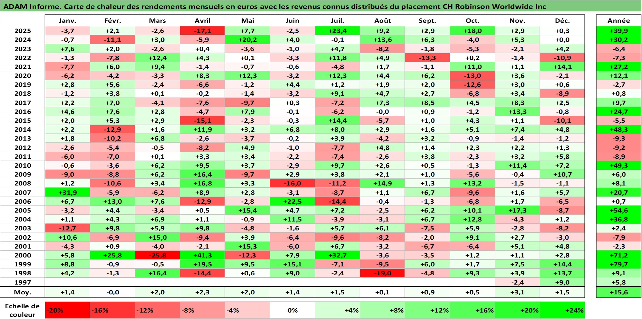 Site dédié aux investisseursPage dédiée sur site financeAnalyse des valorisations hebdomadaires de l'action CH Robinson Worldwide Inc. Cet actif est cote en USD. Les valorisations sont en contrevaleur EURO et couvrent les semaines 1997W42 a 2026W01. Les revenus de cet actif financier sont pris en compte depuis la semaine 1997W50. La note globale ESG de cet actif est estimee a 10.0 (apres rebasage entre 0 et 20).