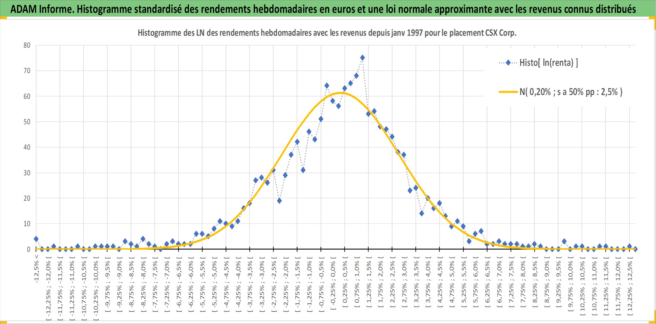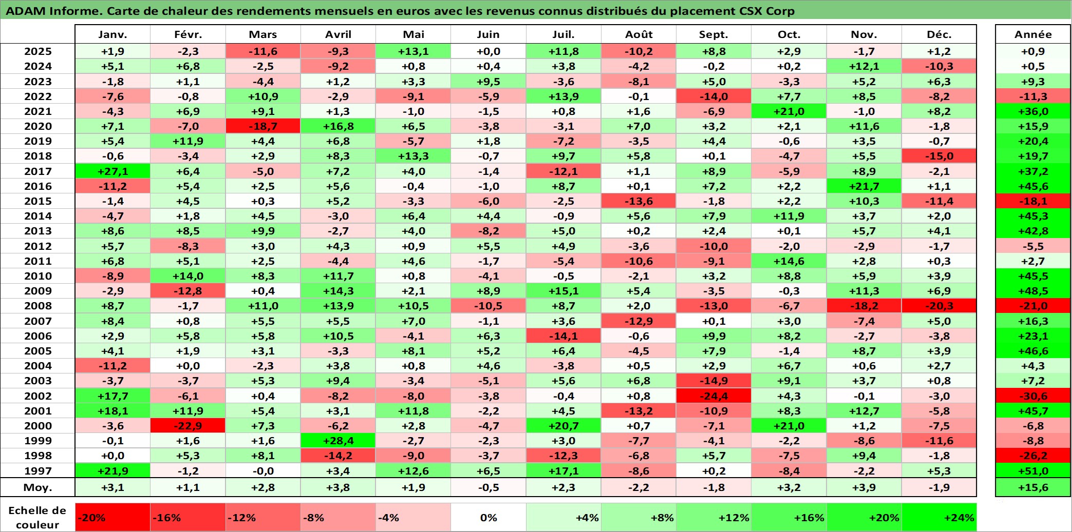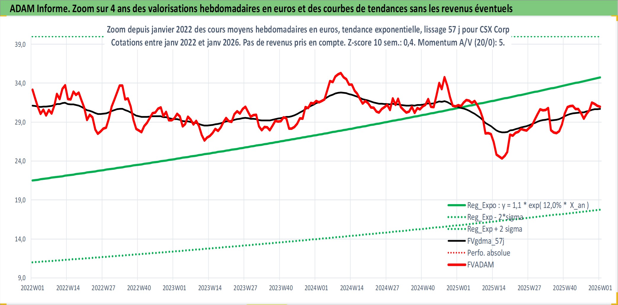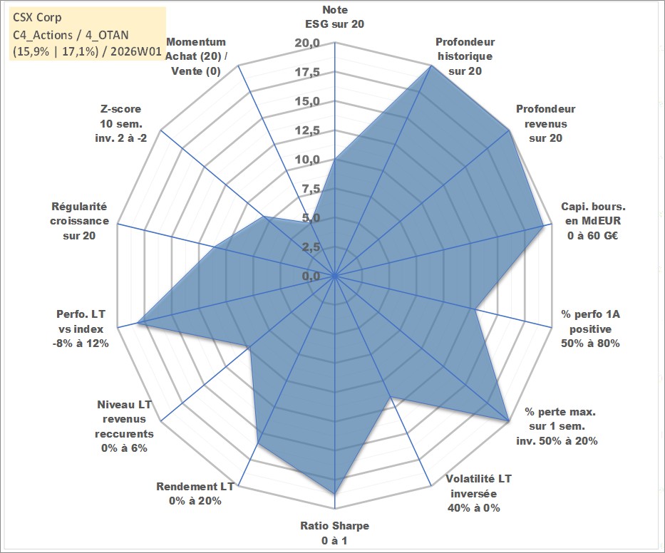 Site dédié aux investisseursPage dédiée sur site financeAnalyse des valorisations hebdomadaires de l'action CSX Corp. Cet actif est cote en USD. Les valorisations sont en contrevaleur EURO et couvrent les semaines 1997W01 a 2026W01. Les revenus de cet actif financier sont pris en compte depuis la semaine 1997W08. La note globale ESG de cet actif est estimee a 10.0 (apres rebasage entre 0 et 20).