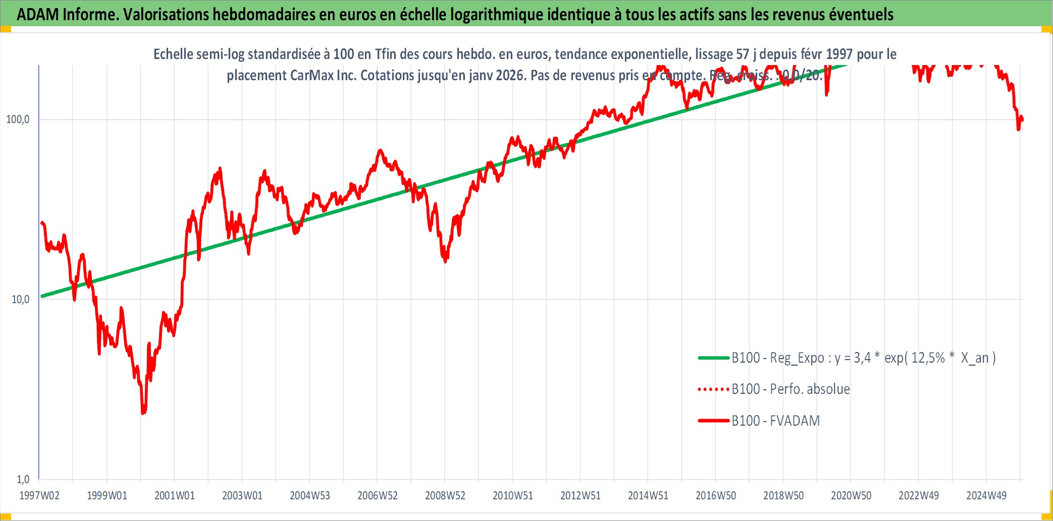 Site dédié aux investisseursPage dédiée sur site financeAnalyse des valorisations hebdomadaires de l'action CarMax Inc. Cet actif est cote en USD. Les valorisations sont en contrevaleur EURO et couvrent les semaines 1997W06 a 2026W01. Les revenus de cet actif financier ne sont pas connus car non existants ou non disponibles sur le site Yahoo Finance. La note globale ESG de cet actif est estimee a 15.0 (apres rebasage entre 0 et 20).