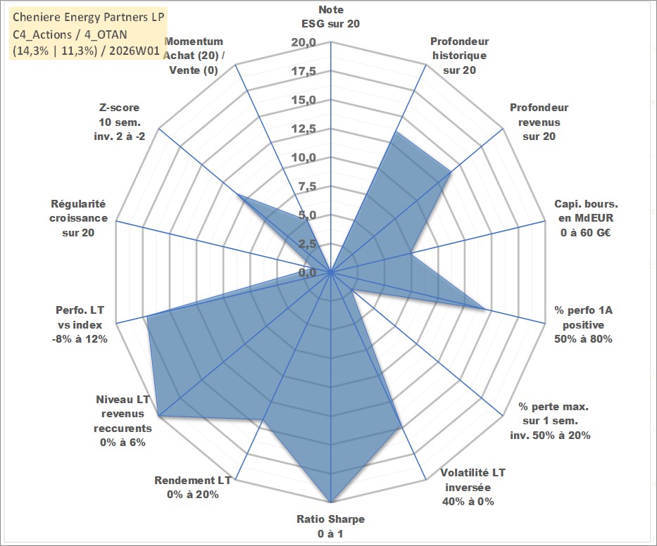 Site dédié aux investisseursPage dédiée sur site financeAnalyse des valorisations hebdomadaires de l'action Cheniere Energy Partners LP. Cet actif est cote en USD. Les valorisations sont en contrevaleur EURO et couvrent les semaines 2007W12 a 2026W01. Les revenus de cet actif financier sont pris en compte depuis la semaine 2007W17. La note ESG de cet actif n'est pas connue.