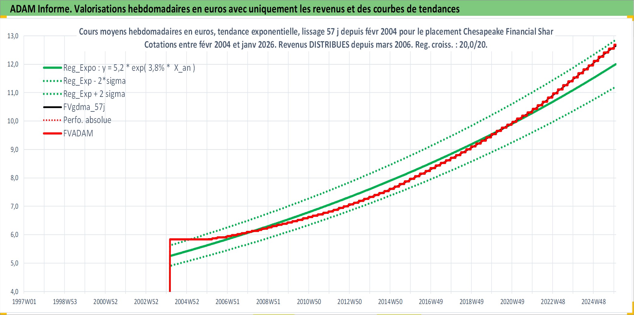 Site dédié aux investisseursPage dédiée sur site financeAnalyse des valorisations hebdomadaires de l'action Chesapeake Financial Shares Inc. Cet actif est cote en USD. Les valorisations sont en contrevaleur EURO et couvrent les semaines 2004W09 a 2026W01. Les revenus de cet actif financier sont pris en compte depuis la semaine 2006W12. La note ESG de cet actif n'est pas connue.