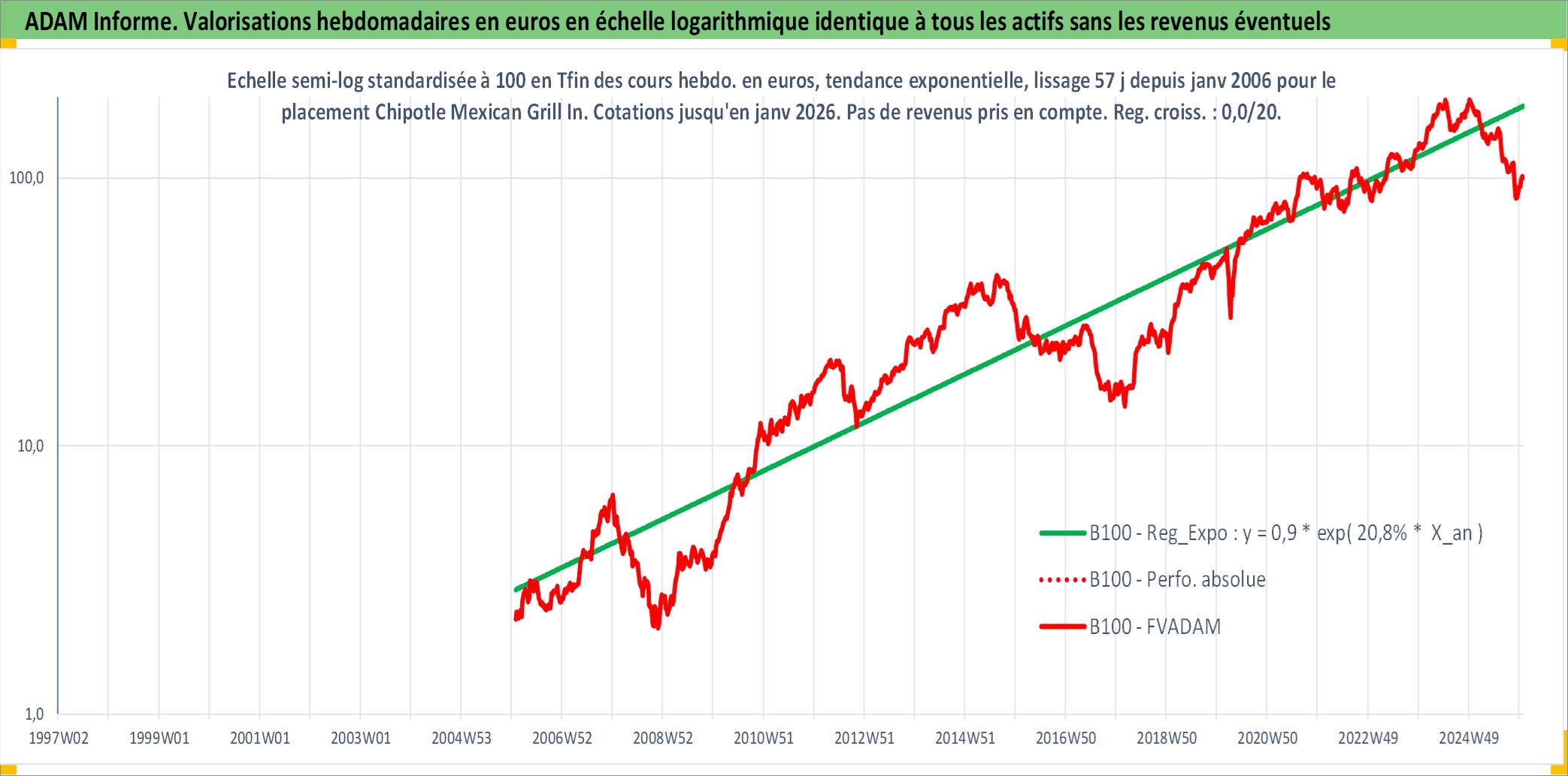 Site dédié aux investisseursPage dédiée sur site financeAnalyse des valorisations hebdomadaires de l'action Chipotle Mexican Grill Inc. Cet actif est cote en USD. Les valorisations sont en contrevaleur EURO et couvrent les semaines 2006W04 a 2026W01. Les revenus de cet actif financier ne sont pas connus car non existants ou non disponibles sur le site Yahoo Finance. La note globale ESG de cet actif est estimee a 8.0 (apres rebasage entre 0 et 20).