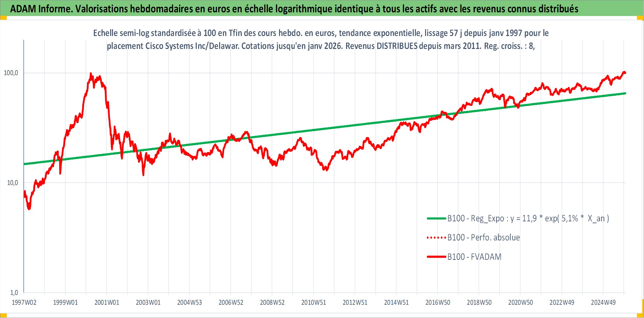 Site dédié aux investisseursPage dédiée sur site financeAnalyse des valorisations hebdomadaires de l'action Cisco Systems Inc/Delaware. Cet actif est cote en USD. Les valorisations sont en contrevaleur EURO et couvrent les semaines 1997W01 a 2026W01. Les revenus de cet actif financier sont pris en compte depuis la semaine 2011W13. La note globale ESG de cet actif est estimee a 15.0 (apres rebasage entre 0 et 20).