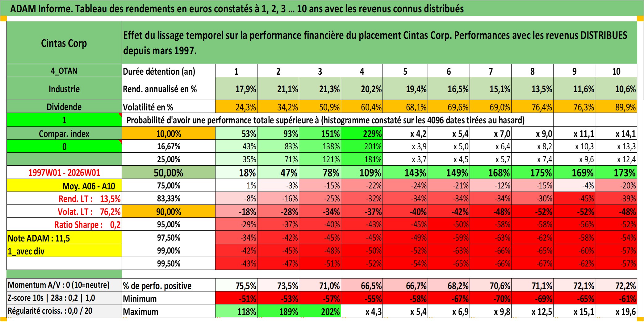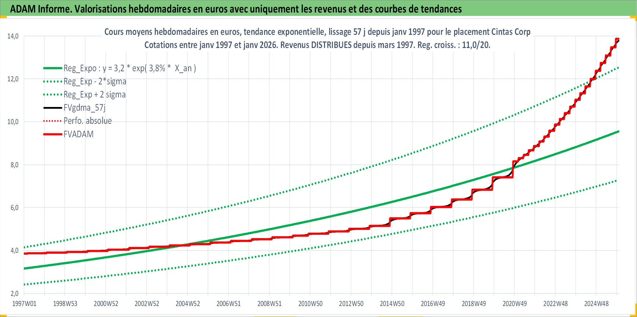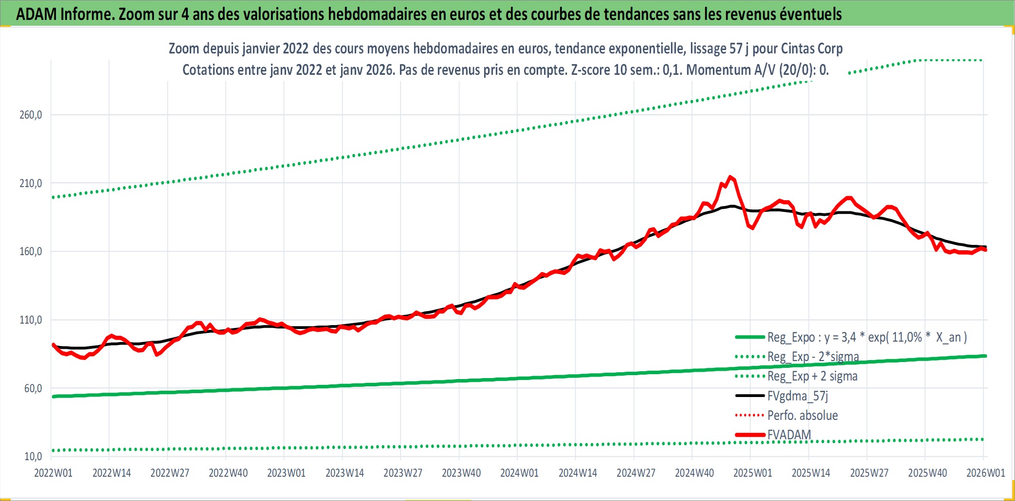 Site dédié aux investisseursPage dédiée sur site financeAnalyse des valorisations hebdomadaires de l'action Cintas Corp. Cet actif est cote en USD. Les valorisations sont en contrevaleur EURO et couvrent les semaines 1997W01 a 2026W01. Les revenus de cet actif financier sont pris en compte depuis la semaine 1997W10. La note globale ESG de cet actif est estimee a 11.0 (apres rebasage entre 0 et 20).