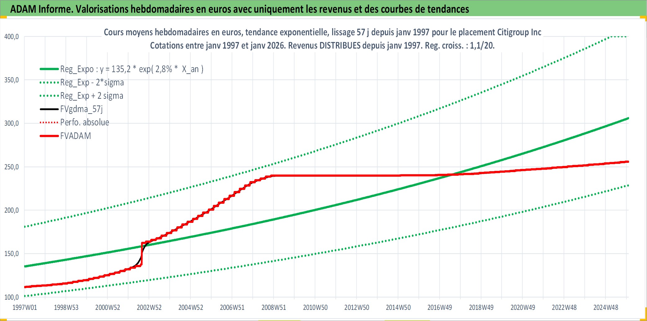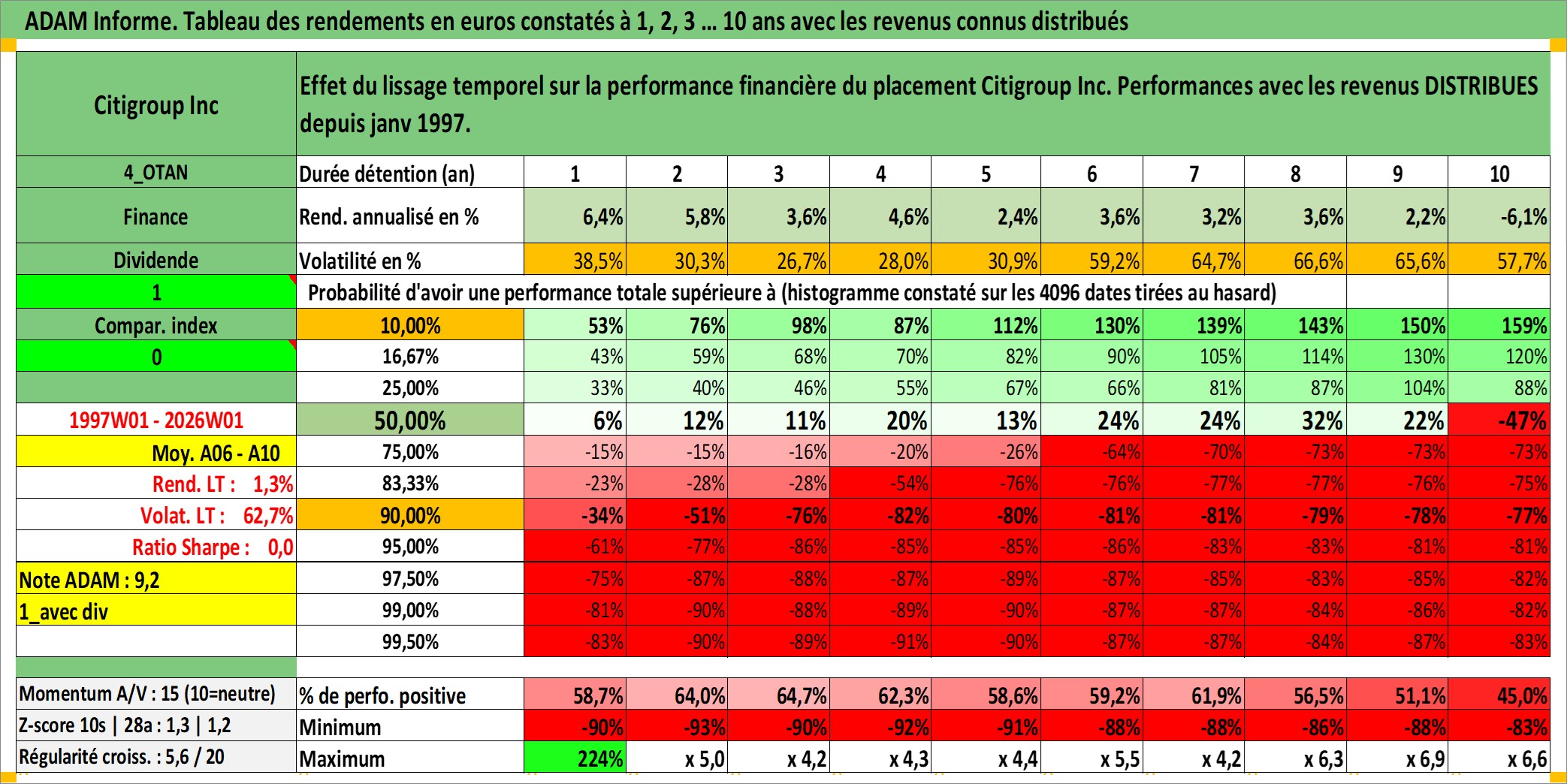 Site dédié aux investisseursPage dédiée sur site financeAnalyse des valorisations hebdomadaires de l'action Citigroup Inc. Cet actif est cote en USD. Les valorisations sont en contrevaleur EURO et couvrent les semaines 1997W01 a 2026W01. Les revenus de cet actif financier sont pris en compte depuis la semaine 1997W05. La note globale ESG de cet actif est estimee a 7.0 (apres rebasage entre 0 et 20).