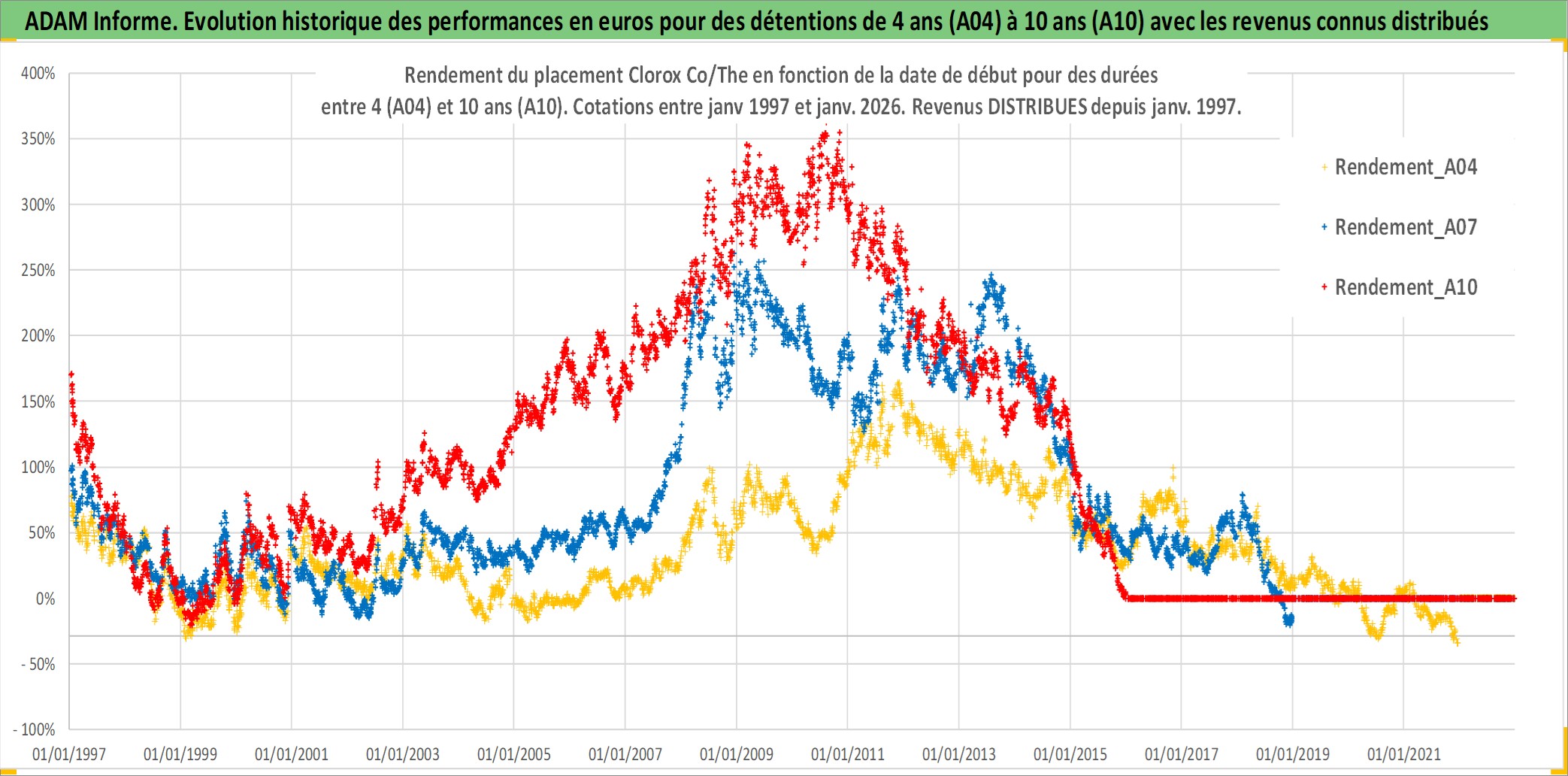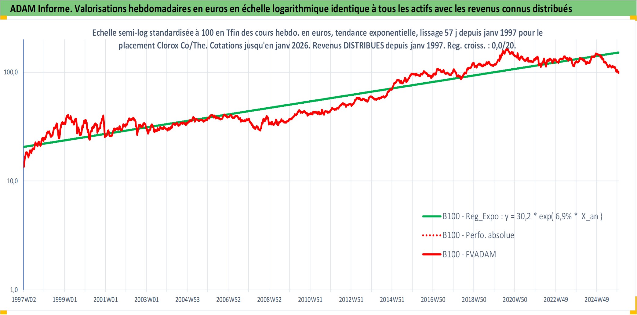 Site dédié aux investisseursPage dédiée sur site financeAnalyse des valorisations hebdomadaires de l'action Clorox Co/The. Cet actif est cote en USD. Les valorisations sont en contrevaleur EURO et couvrent les semaines 1997W01 a 2026W01. Les revenus de cet actif financier sont pris en compte depuis la semaine 1997W05. La note globale ESG de cet actif est estimee a 10.0 (apres rebasage entre 0 et 20).