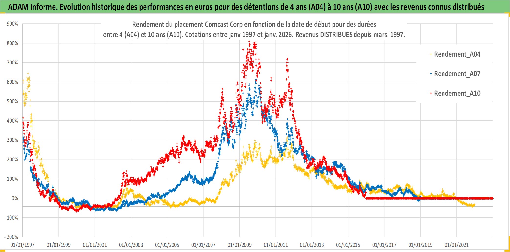 Site dédié aux investisseursPage dédiée sur site financeAnalyse des valorisations hebdomadaires de l'action Comcast Corp. Cet actif est cote en USD. Les valorisations sont en contrevaleur EURO et couvrent les semaines 1997W01 a 2026W01. Les revenus de cet actif financier sont pris en compte depuis la semaine 1997W10. La note globale ESG de cet actif est estimee a 7.0 (apres rebasage entre 0 et 20).