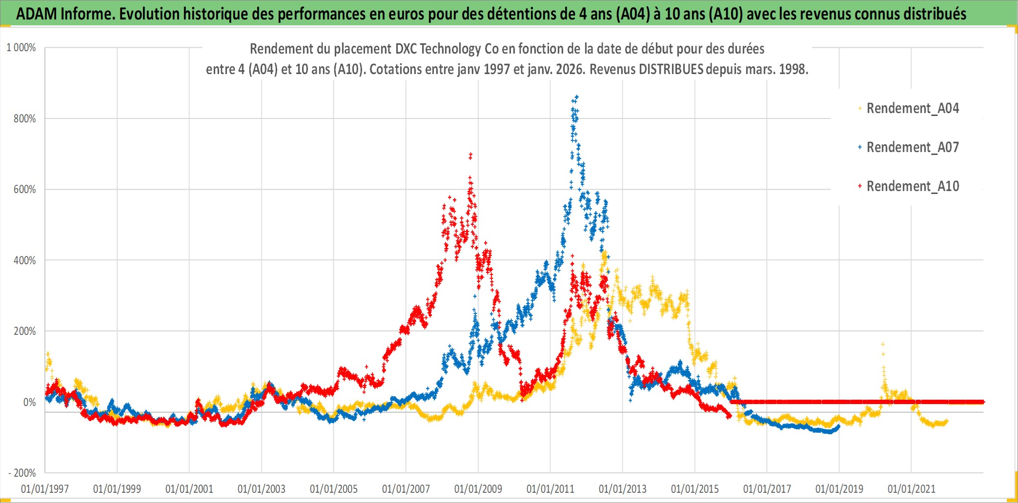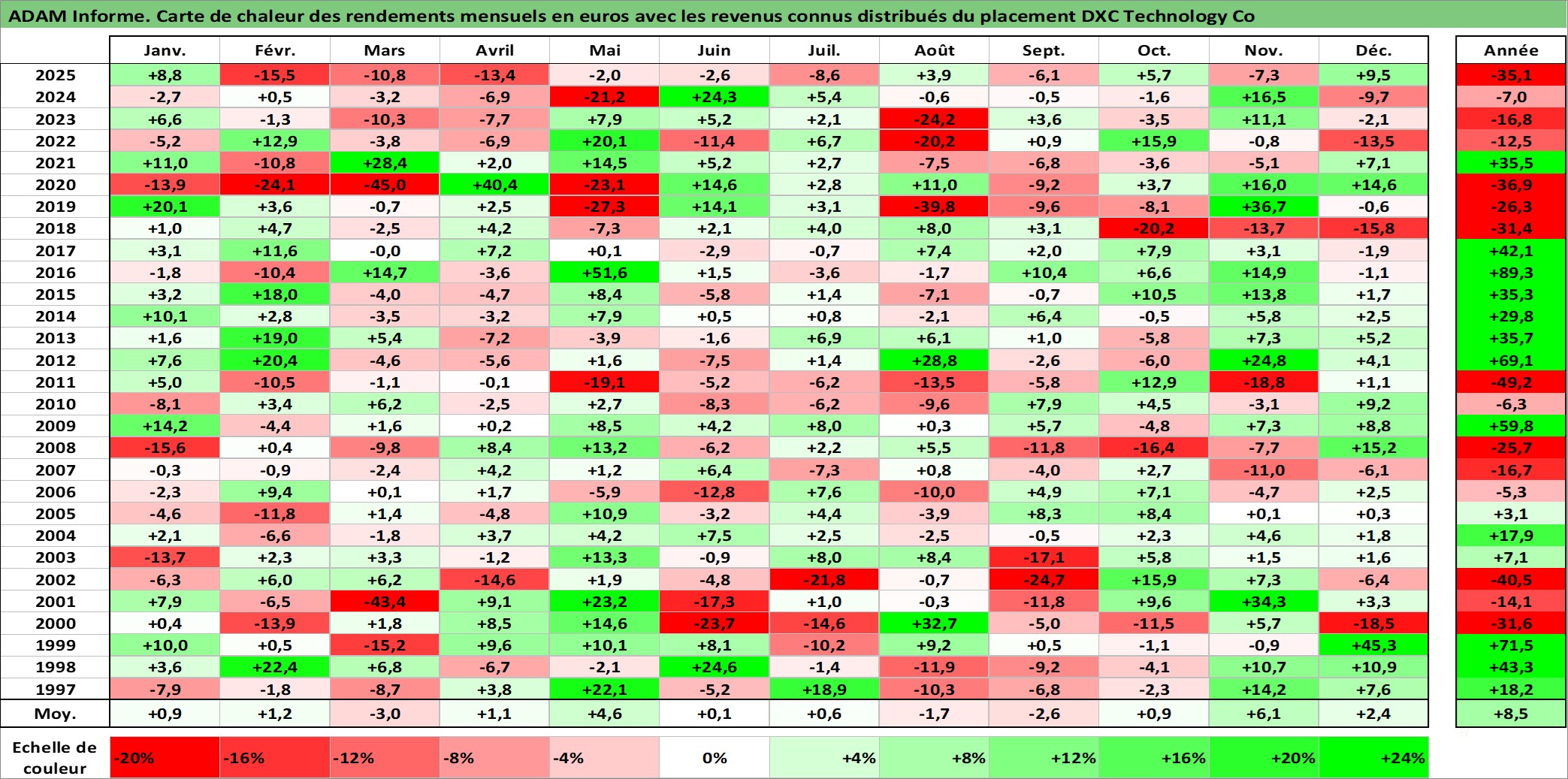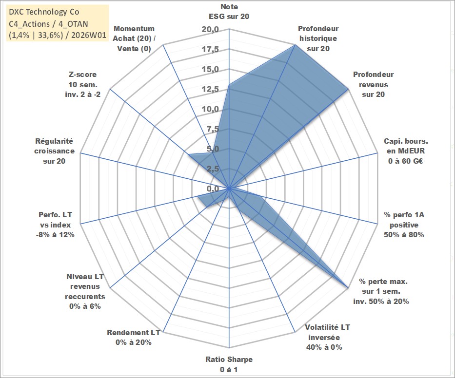 Site dédié aux investisseursPage dédiée sur site financeAnalyse des valorisations hebdomadaires de l'action DXC Technology Co. Cet actif est cote en USD. Les valorisations sont en contrevaleur EURO et couvrent les semaines 1997W01 a 2026W01. Les revenus de cet actif financier sont pris en compte depuis la semaine 1998W13. La note globale ESG de cet actif est estimee a 13.0 (apres rebasage entre 0 et 20).