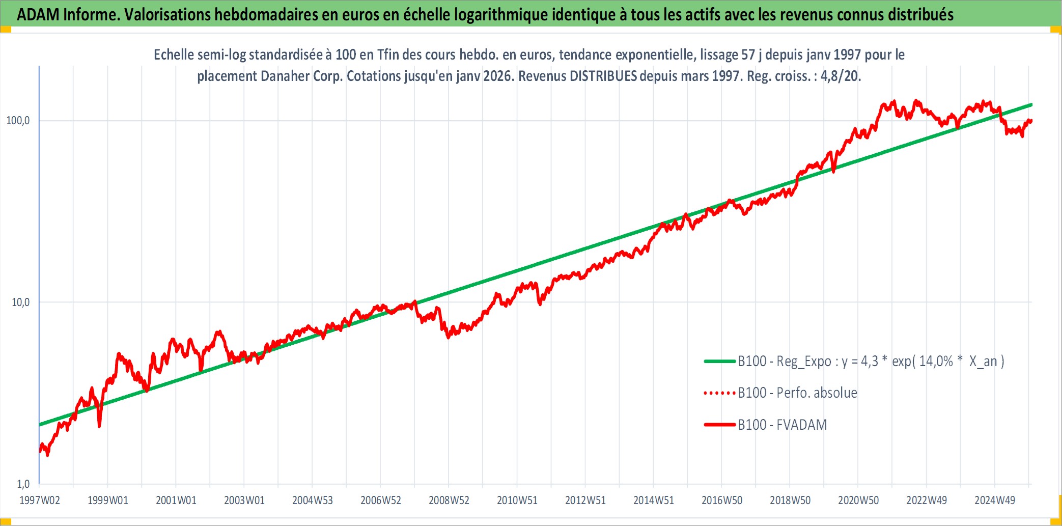 Site dédié aux investisseursPage dédiée sur site financeAnalyse des valorisations hebdomadaires de l'action Danaher Corp. Cet actif est cote en USD. Les valorisations sont en contrevaleur EURO et couvrent les semaines 1997W01 a 2026W01. Les revenus de cet actif financier sont pris en compte depuis la semaine 1997W12. La note globale ESG de cet actif est estimee a 15.0 (apres rebasage entre 0 et 20).