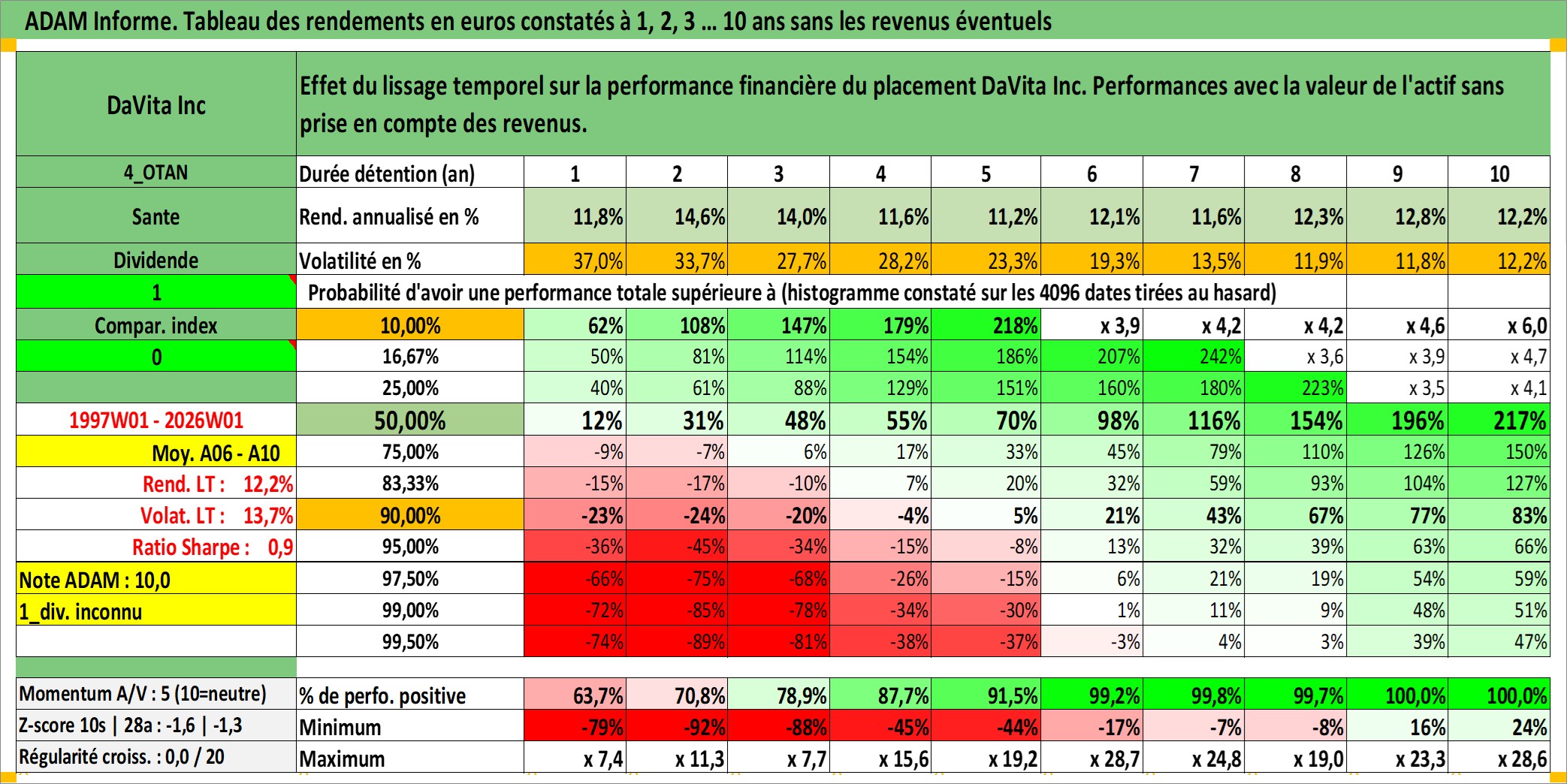 Site dédié aux investisseursPage dédiée sur site financeAnalyse des valorisations hebdomadaires de l'action DaVita Inc. Cet actif est cote en USD. Les valorisations sont en contrevaleur EURO et couvrent les semaines 1997W01 a 2026W01. Les revenus de cet actif financier ne sont pas connus car non existants ou non disponibles sur le site Yahoo Finance. La note globale ESG de cet actif est estimee a 9.0 (apres rebasage entre 0 et 20).