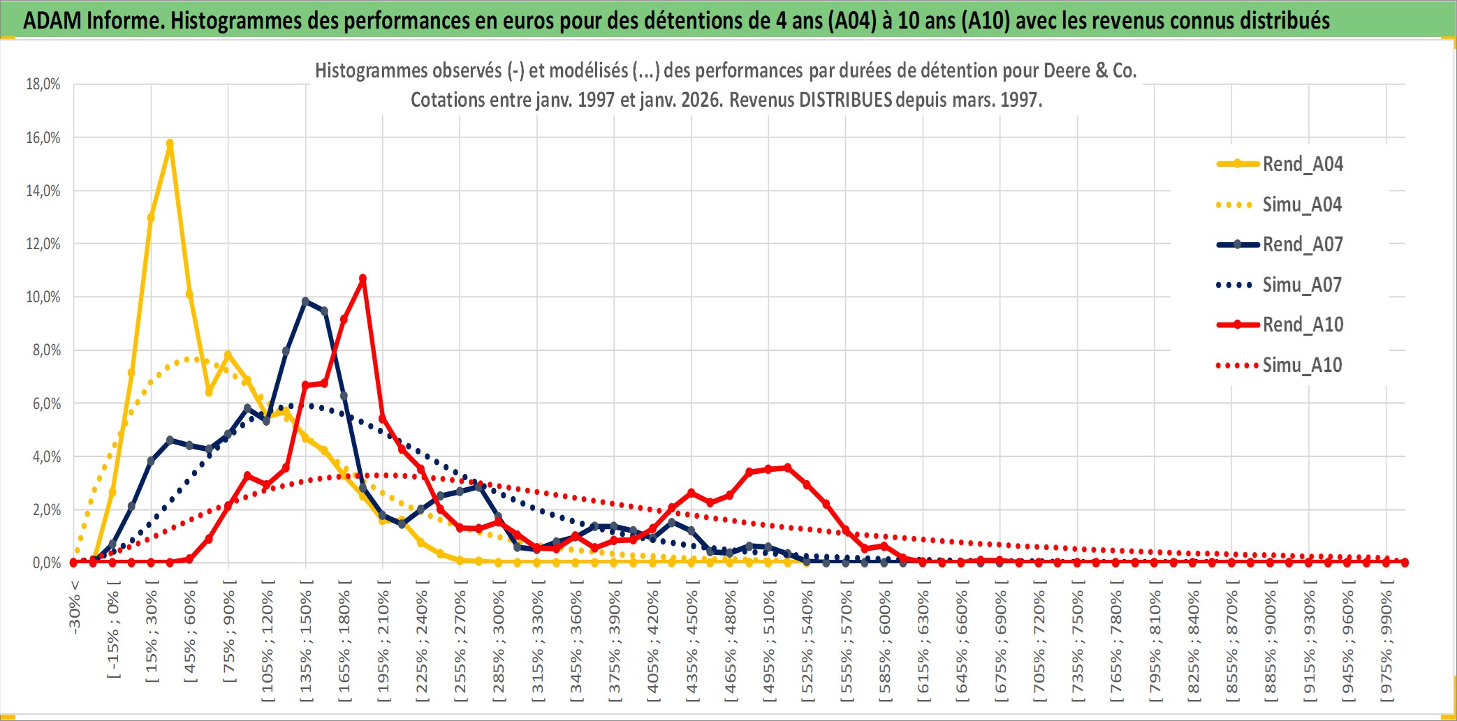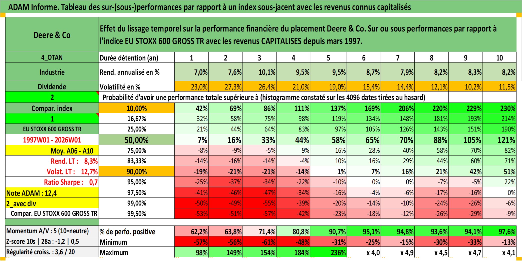 Site dédié aux investisseursPage dédiée sur site financeAnalyse des valorisations hebdomadaires de l'action Deere & Co. Cet actif est cote en USD. Les valorisations sont en contrevaleur EURO et couvrent les semaines 1997W01 a 2026W01. Les revenus de cet actif financier sont pris en compte depuis la semaine 1997W13. La note globale ESG de cet actif est estimee a 12.0 (apres rebasage entre 0 et 20).