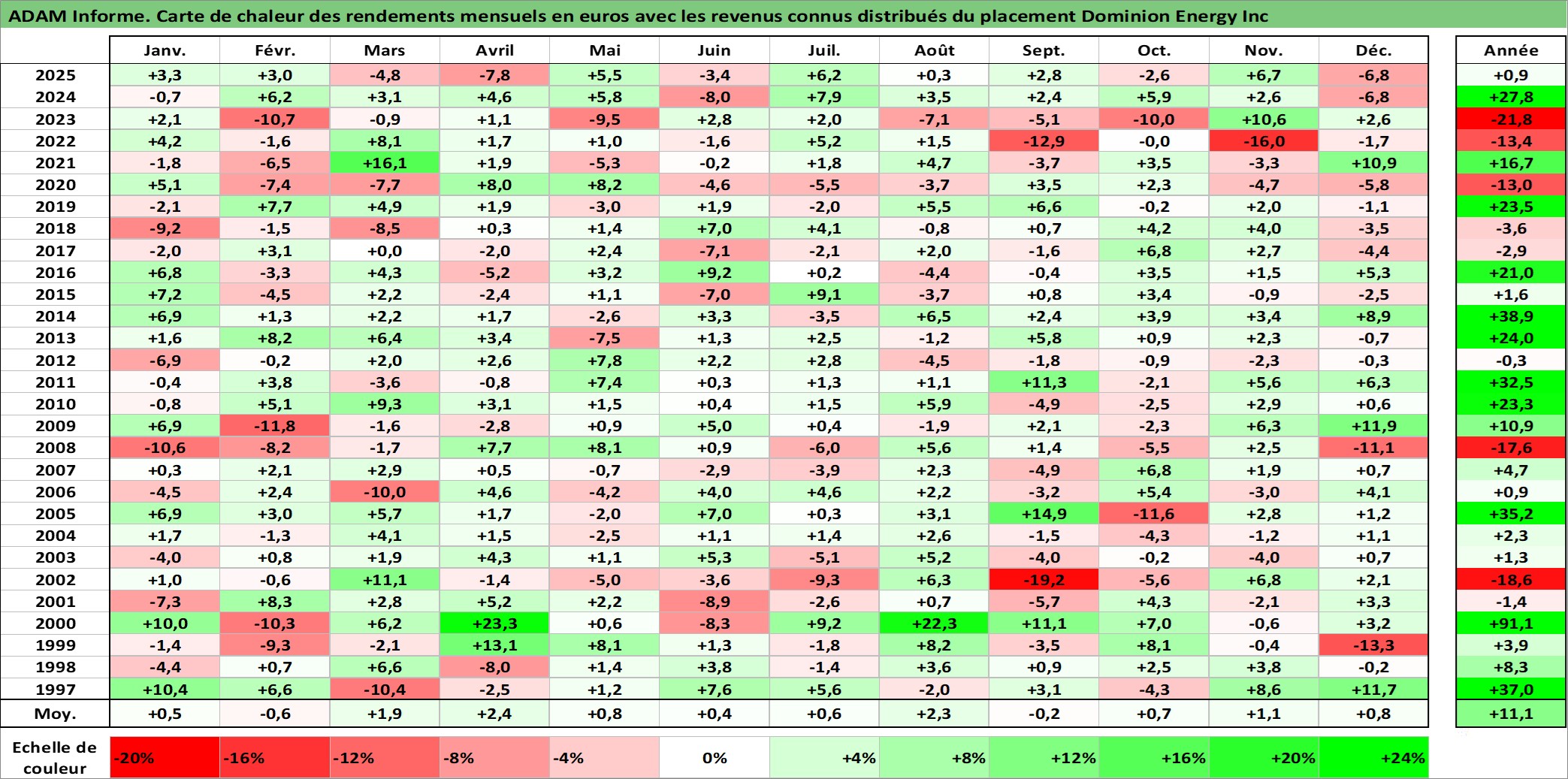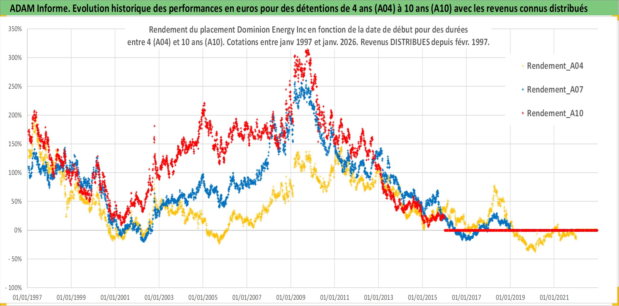 Site dédié aux investisseursPage dédiée sur site financeAnalyse des valorisations hebdomadaires de l'action Dominion Energy Inc. Cet actif est cote en USD. Les valorisations sont en contrevaleur EURO et couvrent les semaines 1997W01 a 2026W01. Les revenus de cet actif financier sont pris en compte depuis la semaine 1997W09. La note globale ESG de cet actif est estimee a 7.0 (apres rebasage entre 0 et 20).