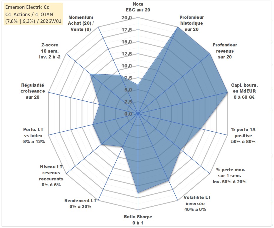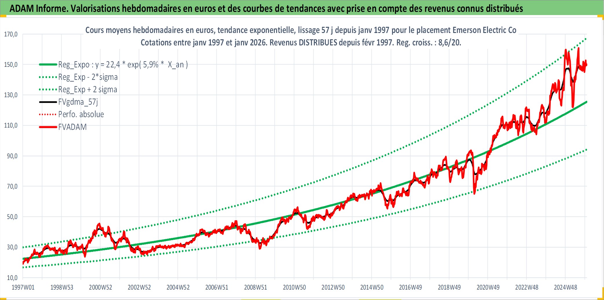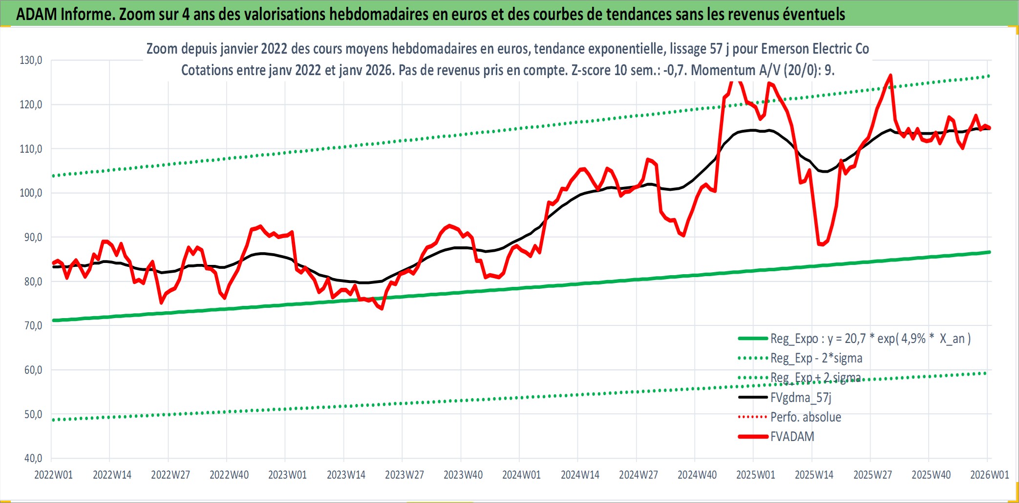 Site dédié aux investisseursPage dédiée sur site financeAnalyse des valorisations hebdomadaires de l'action Emerson Electric Co. Cet actif est cote en USD. Les valorisations sont en contrevaleur EURO et couvrent les semaines 1997W01 a 2026W01. Les revenus de cet actif financier sont pris en compte depuis la semaine 1997W08. La note globale ESG de cet actif est estimee a 6.0 (apres rebasage entre 0 et 20).