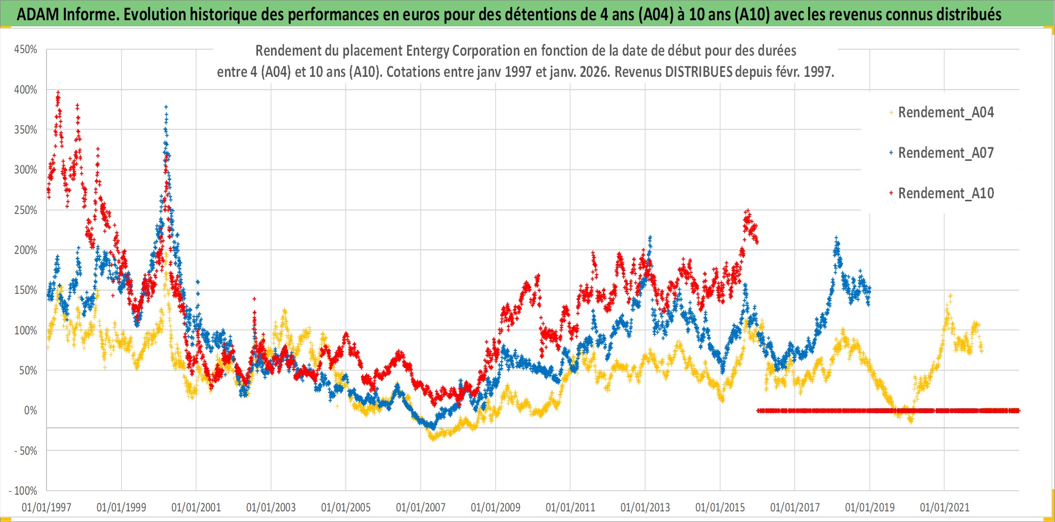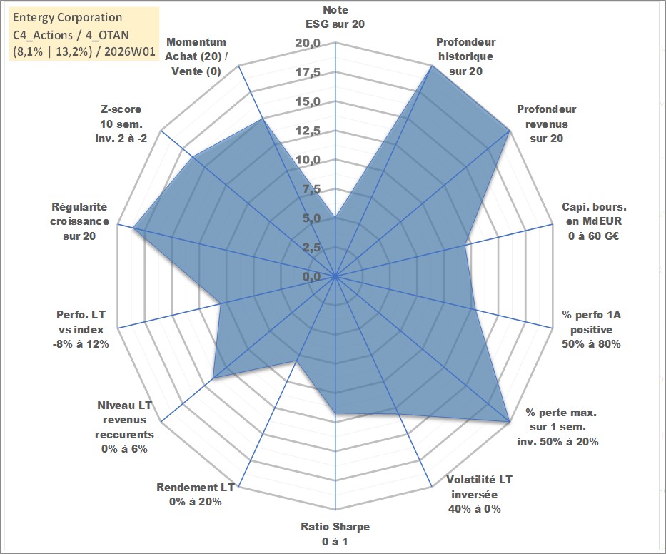 Site dédié aux investisseursPage dédiée sur site financeAnalyse des valorisations hebdomadaires de l'action Entergy Corporation. Cet actif est cote en USD. Les valorisations sont en contrevaleur EURO et couvrent les semaines 1997W01 a 2026W01. Les revenus de cet actif financier sont pris en compte depuis la semaine 1997W07. La note globale ESG de cet actif est estimee a 5.0 (apres rebasage entre 0 et 20).