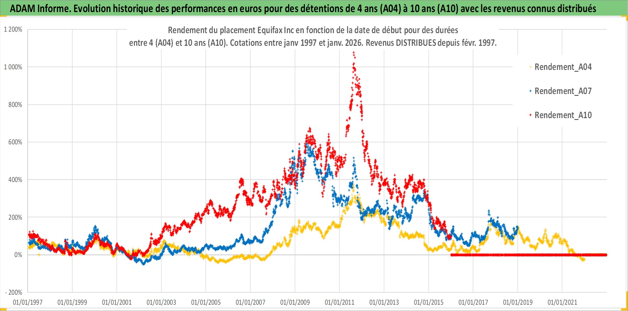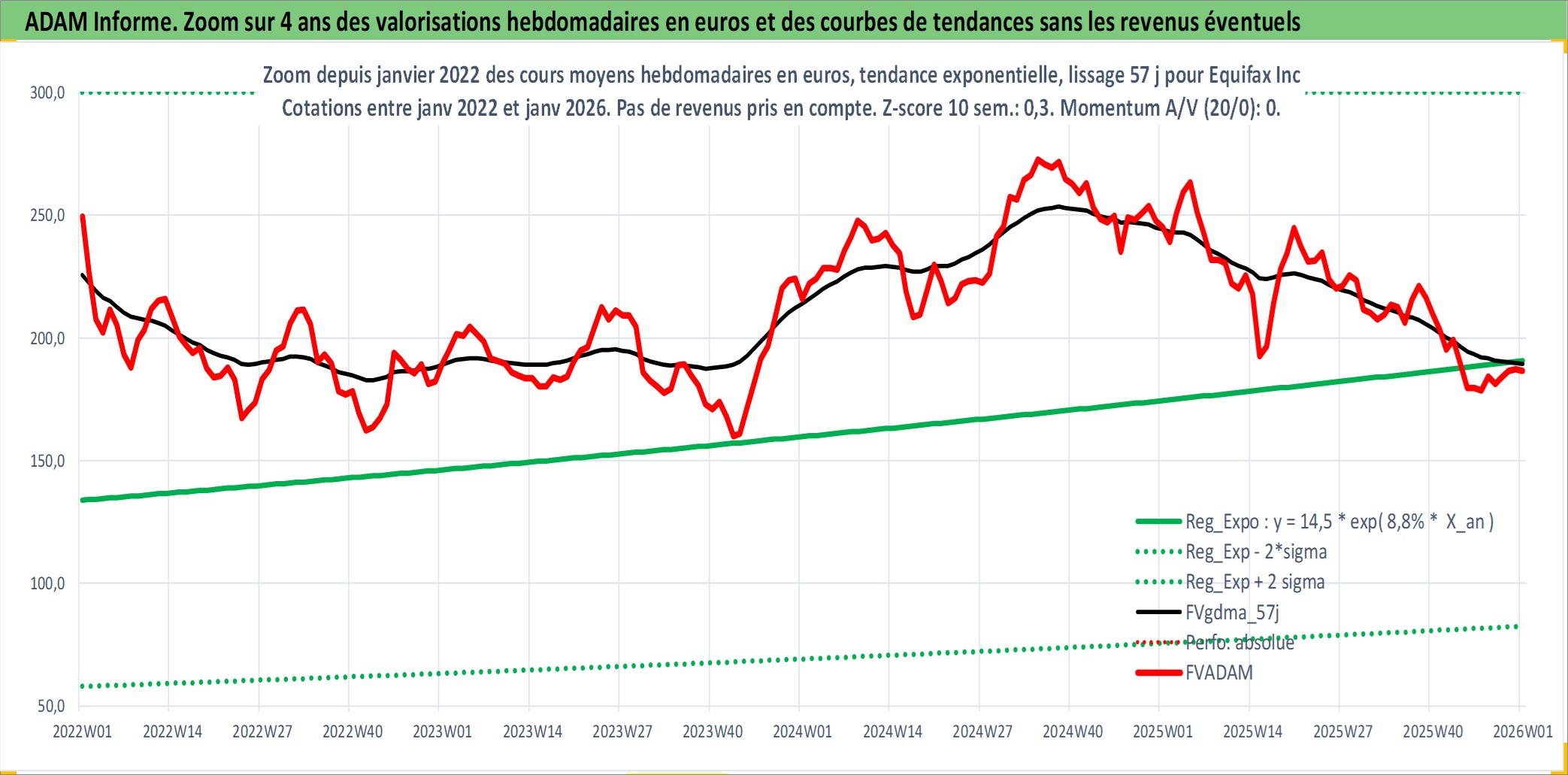 Site dédié aux investisseursPage dédiée sur site financeAnalyse des valorisations hebdomadaires de l'action Equifax Inc. Cet actif est cote en USD. Les valorisations sont en contrevaleur EURO et couvrent les semaines 1997W01 a 2026W01. Les revenus de cet actif financier sont pris en compte depuis la semaine 1997W08. La note globale ESG de cet actif est estimee a 7.0 (apres rebasage entre 0 et 20).