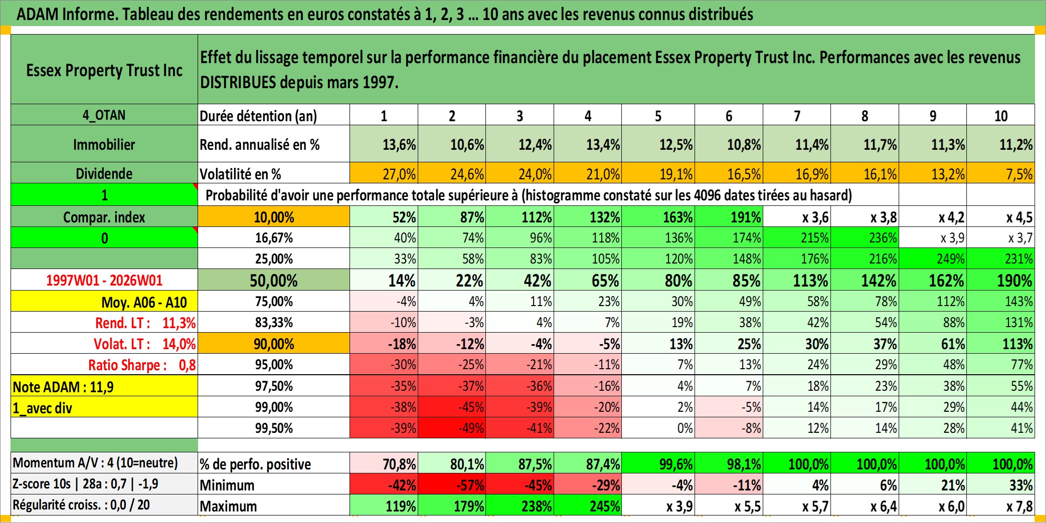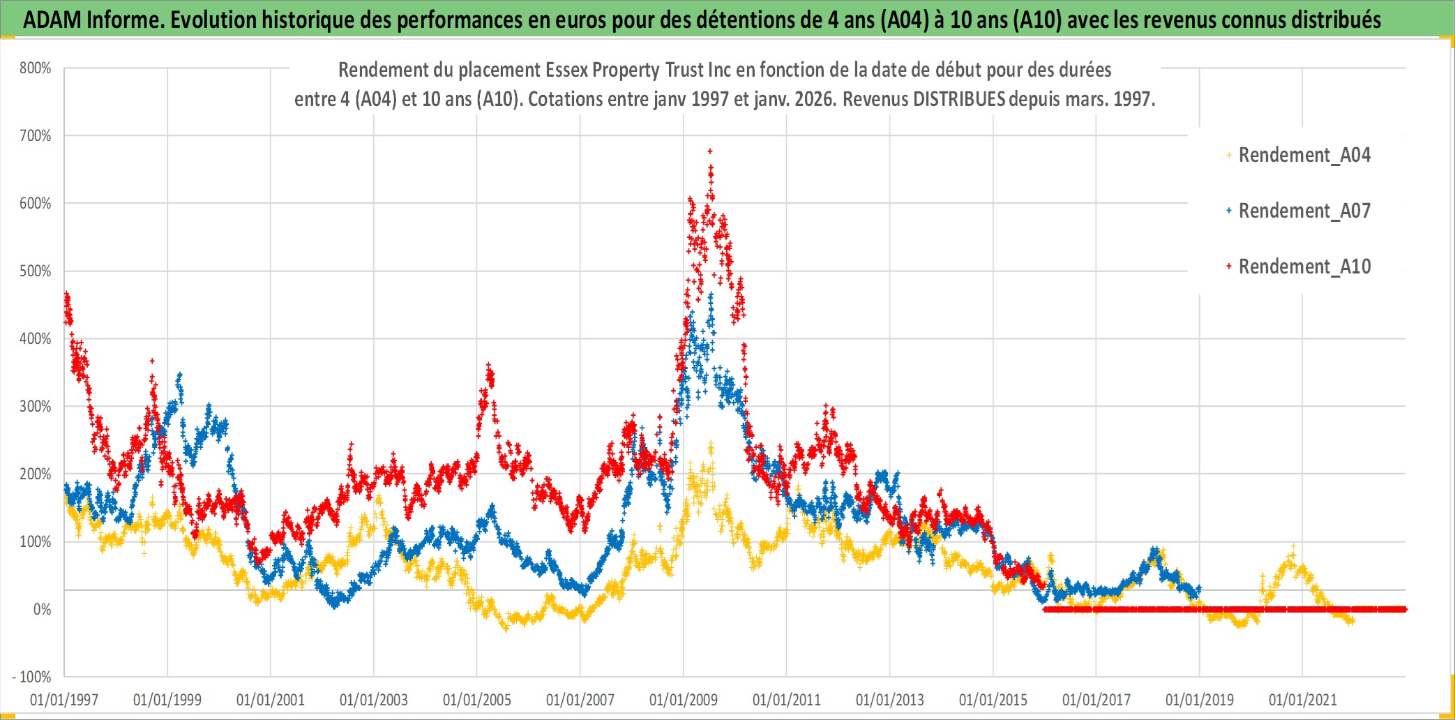 Site dédié aux investisseursPage dédiée sur site financeAnalyse des valorisations hebdomadaires de l'action Essex Property Trust Inc. Cet actif est cote en USD. Les valorisations sont en contrevaleur EURO et couvrent les semaines 1997W01 a 2026W01. Les revenus de cet actif financier sont pris en compte depuis la semaine 1997W13. La note globale ESG de cet actif est estimee a 15.0 (apres rebasage entre 0 et 20).
