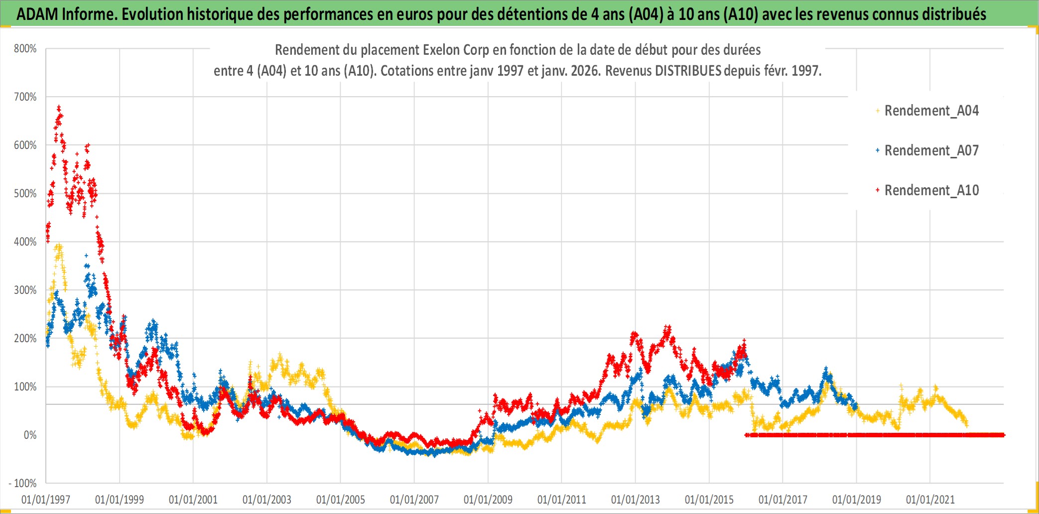 Site dédié aux investisseursPage dédiée sur site financeAnalyse des valorisations hebdomadaires de l'action Exelon Corp. Cet actif est cote en USD. Les valorisations sont en contrevaleur EURO et couvrent les semaines 1997W01 a 2026W01. Les revenus de cet actif financier sont pris en compte depuis la semaine 1997W08. La note globale ESG de cet actif est estimee a 8.0 (apres rebasage entre 0 et 20).