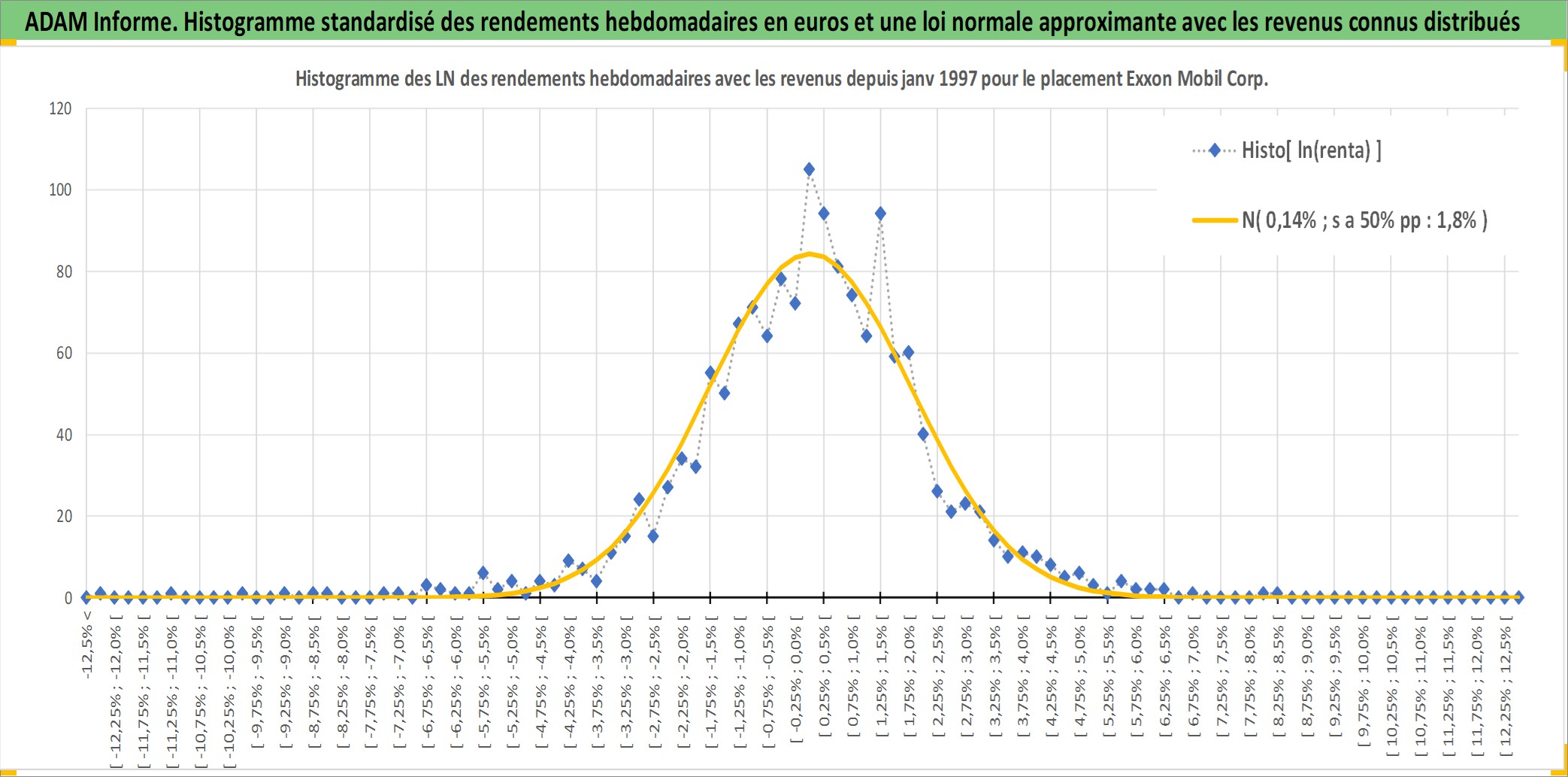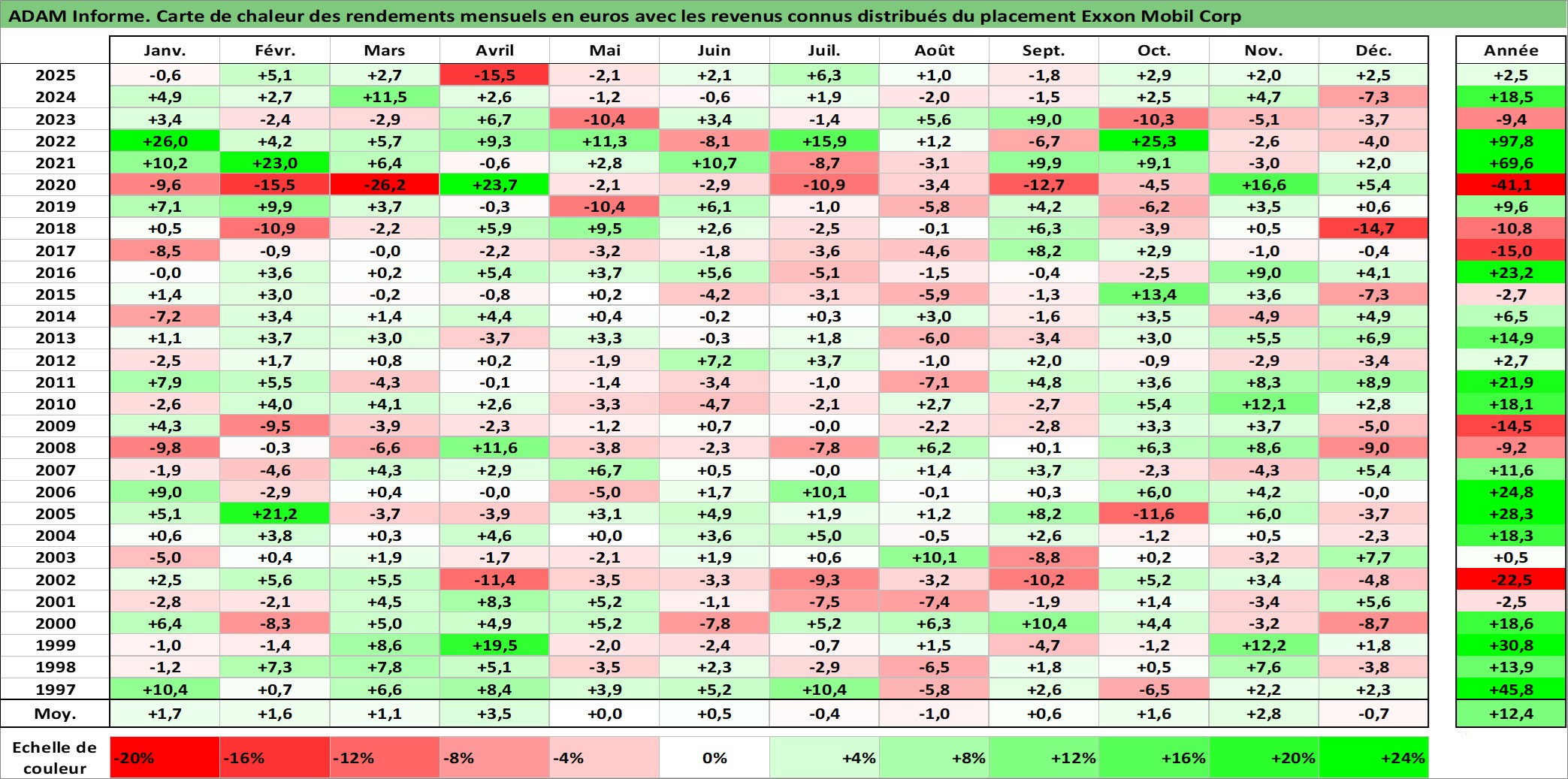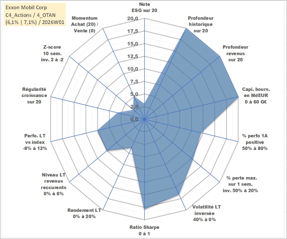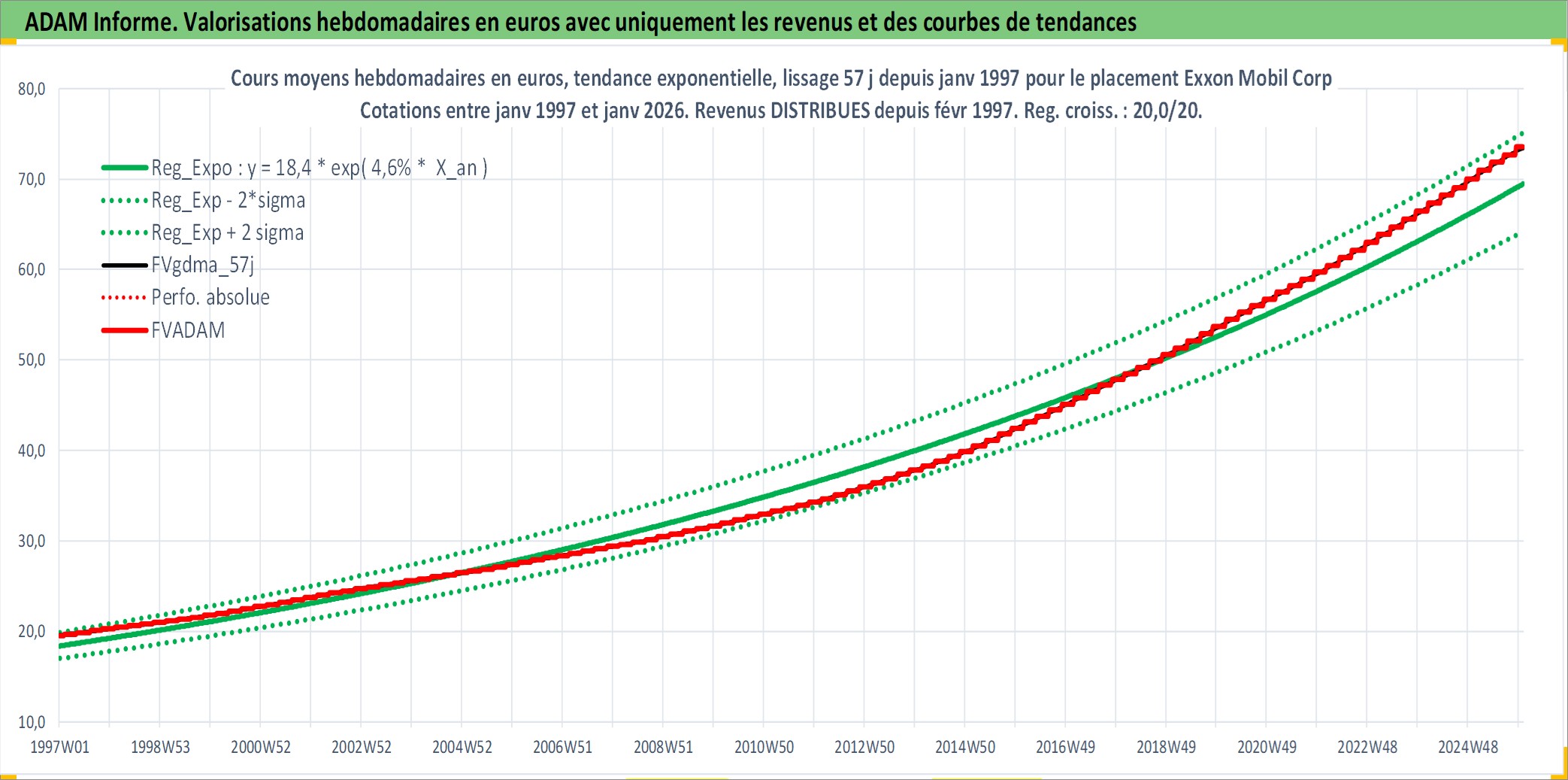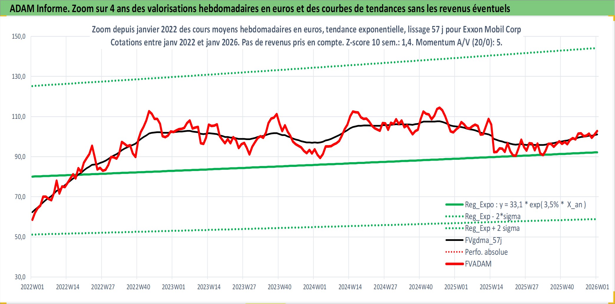 Site dédié aux investisseursPage dédiée sur site financeAnalyse des valorisations hebdomadaires de l'action Exxon Mobil Corp. Cet actif est cote en USD. Les valorisations sont en contrevaleur EURO et couvrent les semaines 1997W01 a 2026W01. Les revenus de cet actif financier sont pris en compte depuis la semaine 1997W06. La note globale ESG de cet actif est estimee a 3.0 (apres rebasage entre 0 et 20).