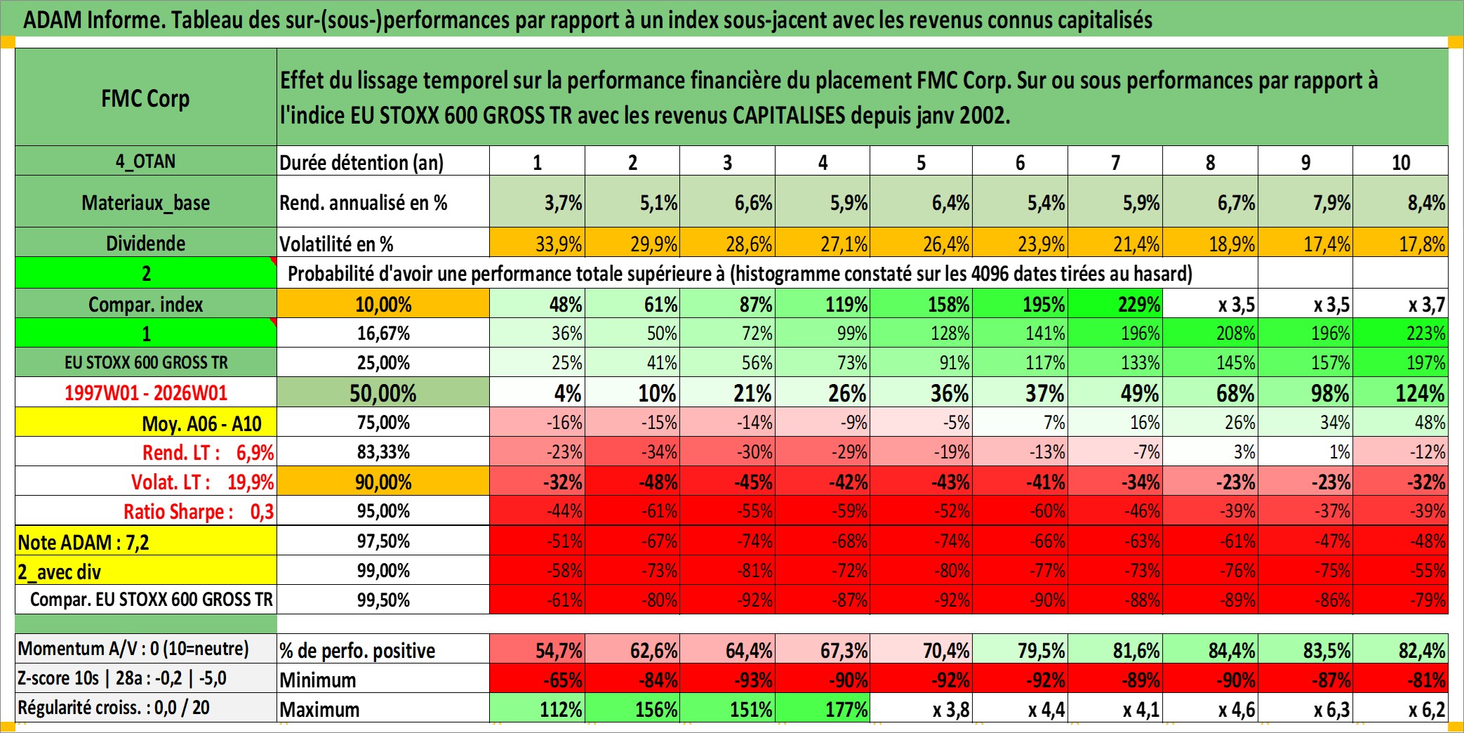 Site dédié aux investisseursPage dédiée sur site financeAnalyse des valorisations hebdomadaires de l'action FMC Corp. Cet actif est cote en USD. Les valorisations sont en contrevaleur EURO et couvrent les semaines 1997W01 a 2026W01. Les revenus de cet actif financier sont pris en compte depuis la semaine 2002W01. La note globale ESG de cet actif est estimee a 4.0 (apres rebasage entre 0 et 20).