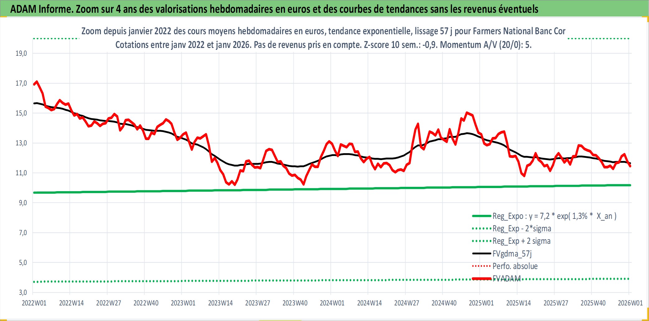 Site dédié aux investisseursPage dédiée sur site financeAnalyse des valorisations hebdomadaires de l'action Farmers National Banc Corp. Cet actif est cote en USD. Les valorisations sont en contrevaleur EURO et couvrent les semaines 1999W01 a 2026W01. Les revenus de cet actif financier sont pris en compte depuis la semaine 2000W36. La note ESG de cet actif n'est pas connue.