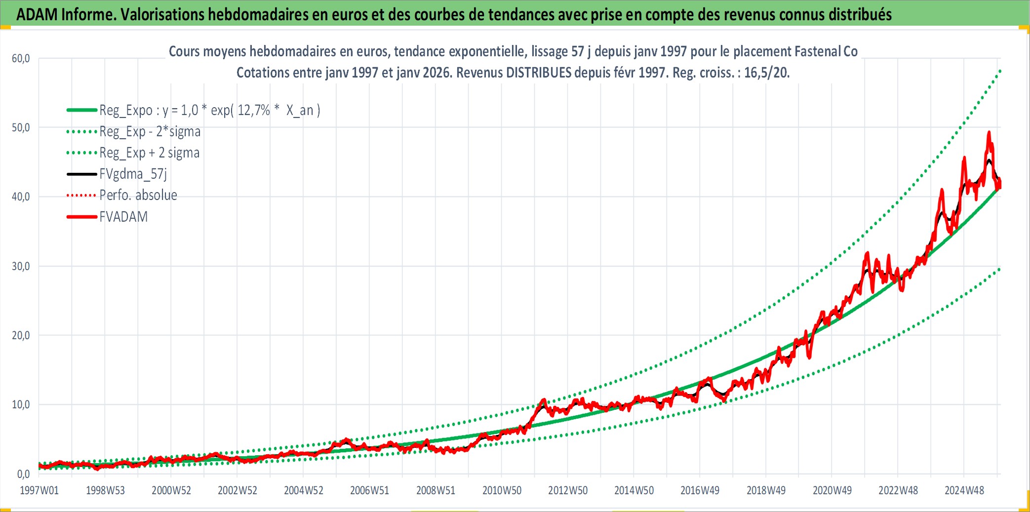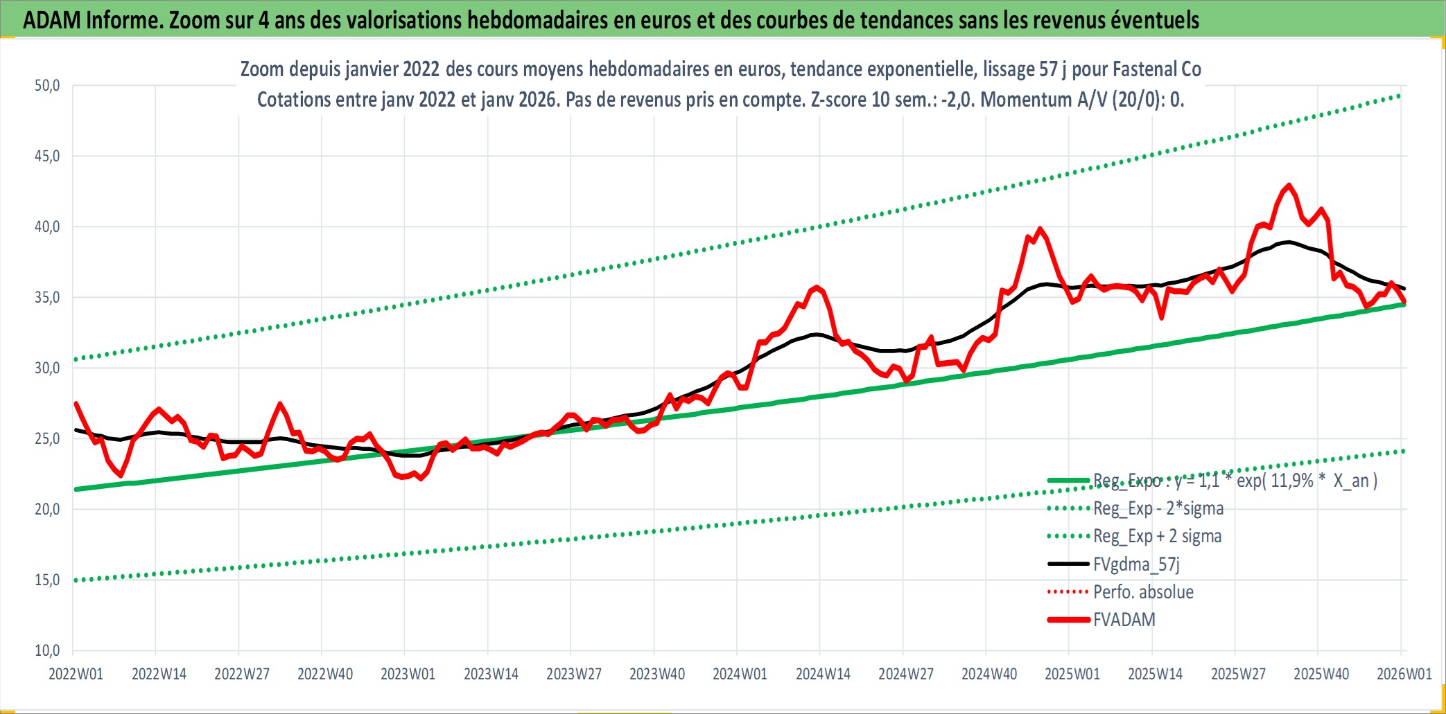 Site dédié aux investisseursPage dédiée sur site financeAnalyse des valorisations hebdomadaires de l'action Fastenal Co. Cet actif est cote en USD. Les valorisations sont en contrevaleur EURO et couvrent les semaines 1997W01 a 2026W01. Les revenus de cet actif financier sont pris en compte depuis la semaine 1997W09. La note globale ESG de cet actif est estimee a 7.0 (apres rebasage entre 0 et 20).