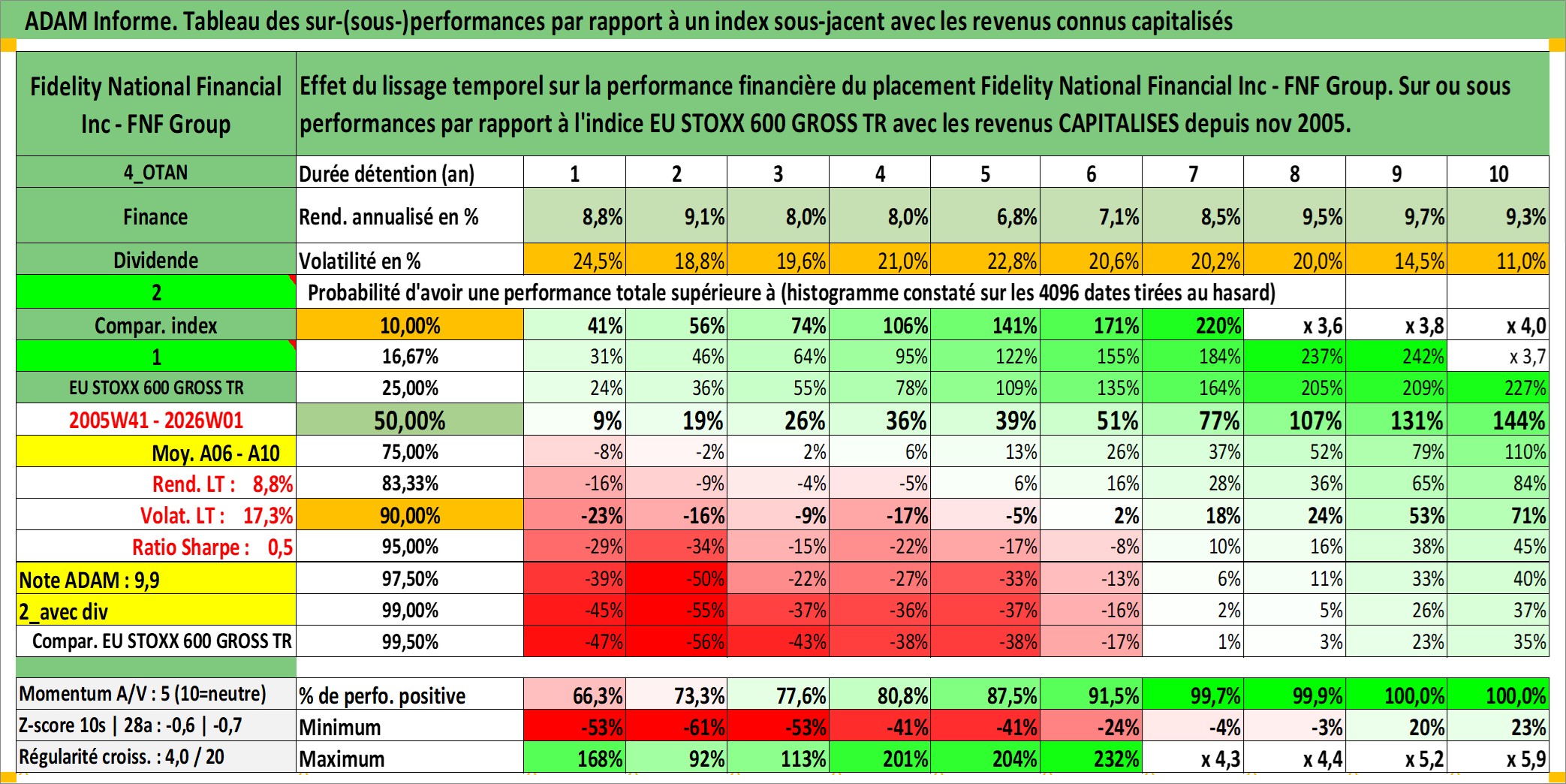 Site dédié aux investisseursPage dédiée sur site financeAnalyse des valorisations hebdomadaires de l'action Fidelity National Financial Inc - FNF Group. Cet actif est cote en USD. Les valorisations sont en contrevaleur EURO et couvrent les semaines 2005W41 a 2026W01. Les revenus de cet actif financier sont pris en compte depuis la semaine 2005W48. La note globale ESG de cet actif est estimee a 8.0 (apres rebasage entre 0 et 20).