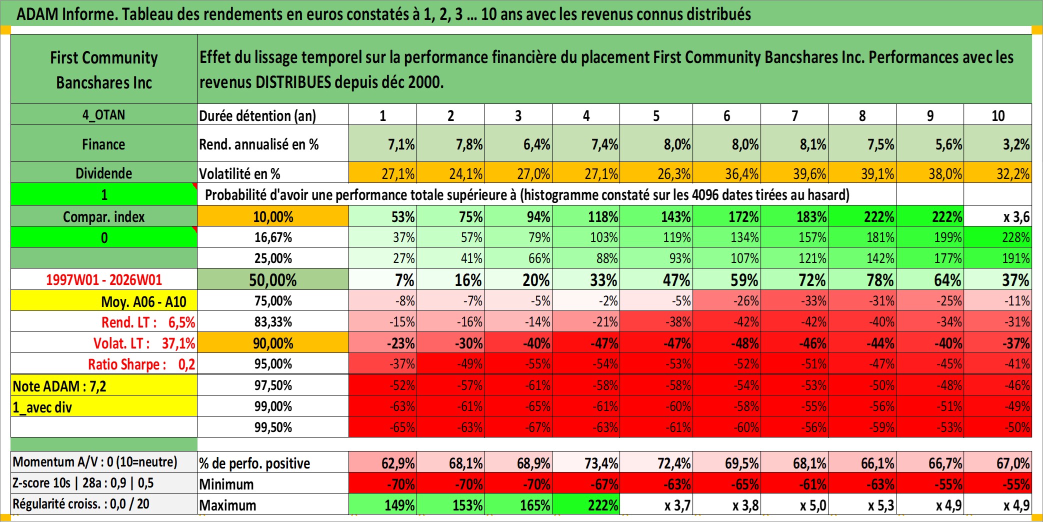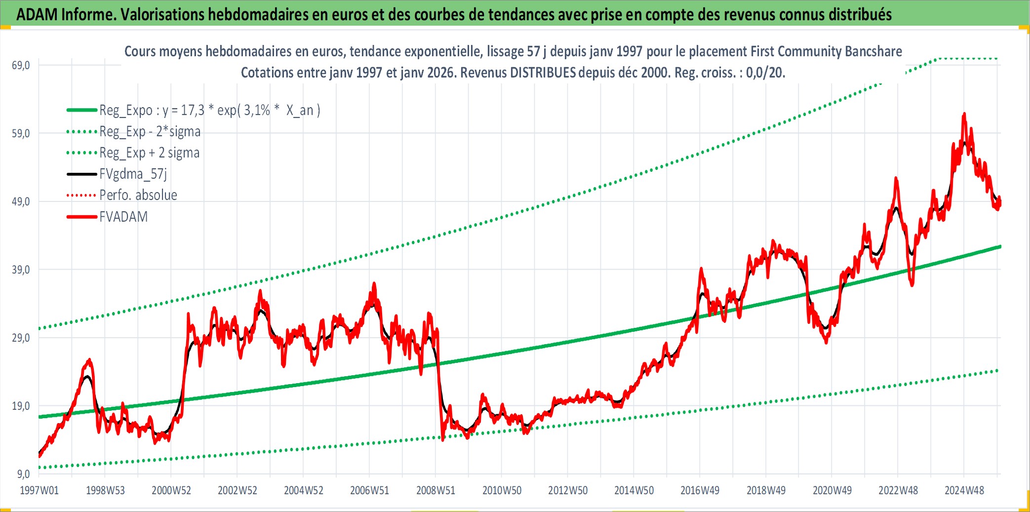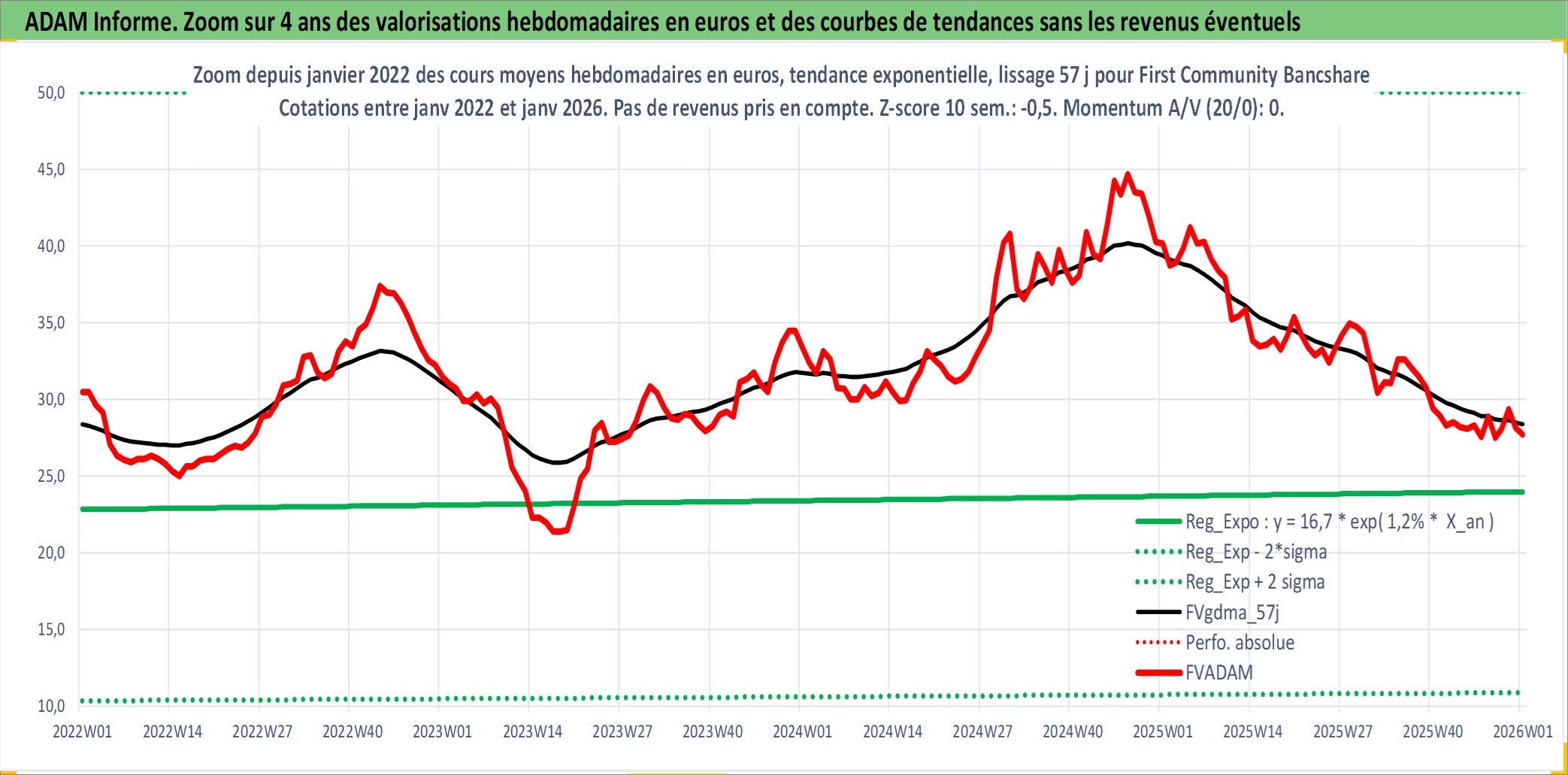 Site dédié aux investisseursPage dédiée sur site financeAnalyse des valorisations hebdomadaires de l'action First Community Bancshares Inc. Cet actif est cote en USD. Les valorisations sont en contrevaleur EURO et couvrent les semaines 1997W01 a 2026W01. Les revenus de cet actif financier sont pris en compte depuis la semaine 2000W50. La note ESG de cet actif n'est pas connue.