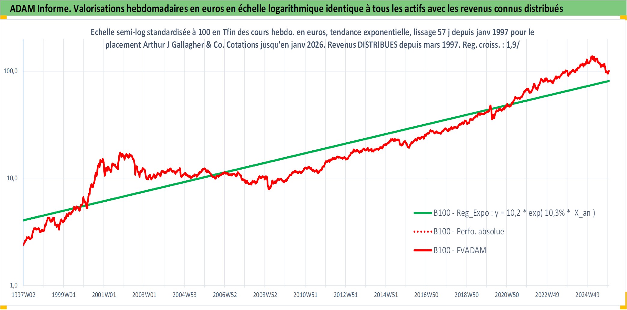 Site dédié aux investisseursPage dédiée sur site financeAnalyse des valorisations hebdomadaires de l'action Arthur J Gallagher & Co. Cet actif est cote en USD. Les valorisations sont en contrevaleur EURO et couvrent les semaines 1997W01 a 2026W01. Les revenus de cet actif financier sont pris en compte depuis la semaine 1997W13. La note globale ESG de cet actif est estimee a 10.0 (apres rebasage entre 0 et 20).