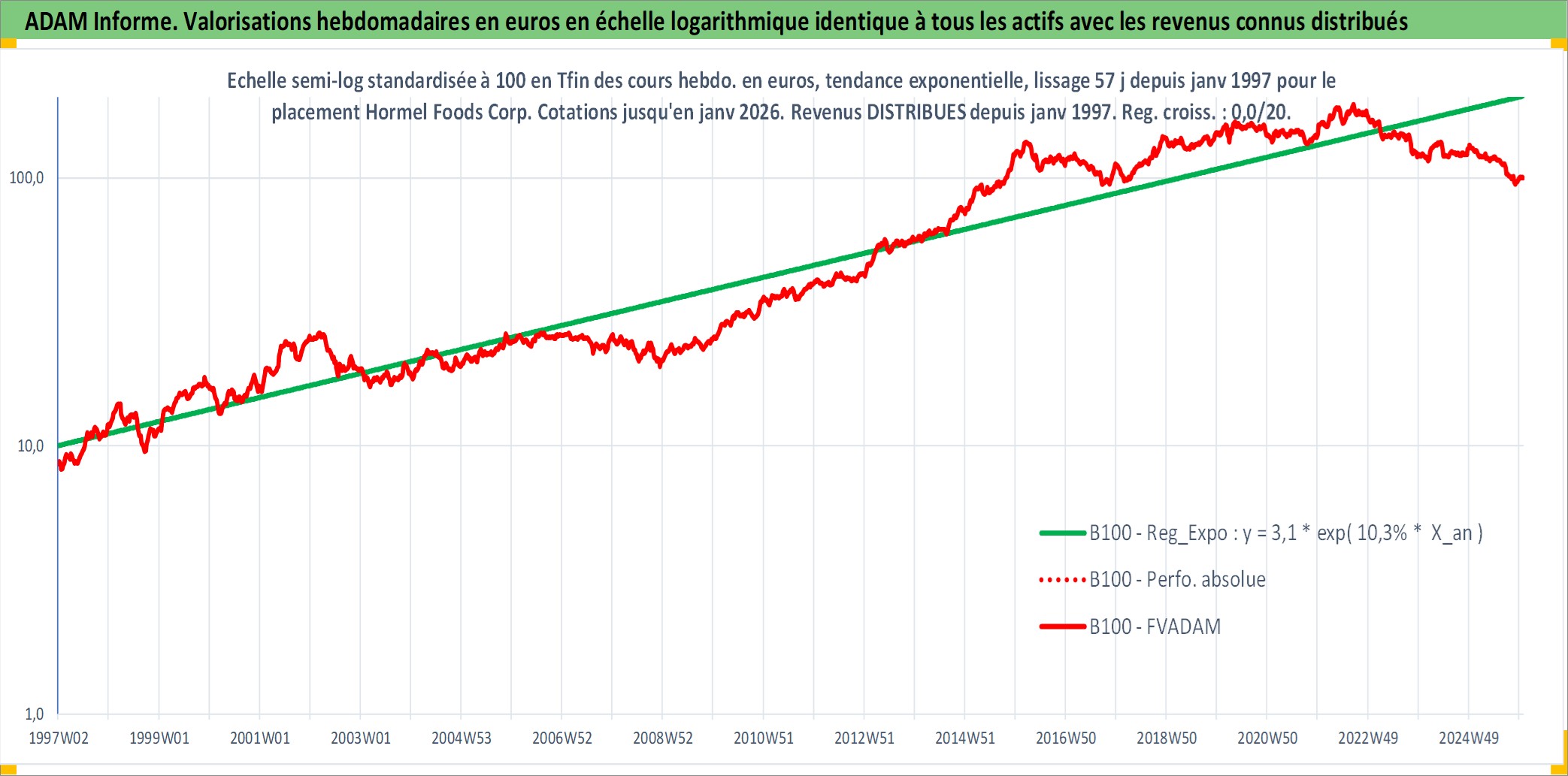 Site dédié aux investisseursPage dédiée sur site financeAnalyse des valorisations hebdomadaires de l'action Hormel Foods Corp. Cet actif est cote en USD. Les valorisations sont en contrevaleur EURO et couvrent les semaines 1997W01 a 2026W01. Les revenus de cet actif financier sont pris en compte depuis la semaine 1997W03. La note globale ESG de cet actif est estimee a 5.0 (apres rebasage entre 0 et 20).