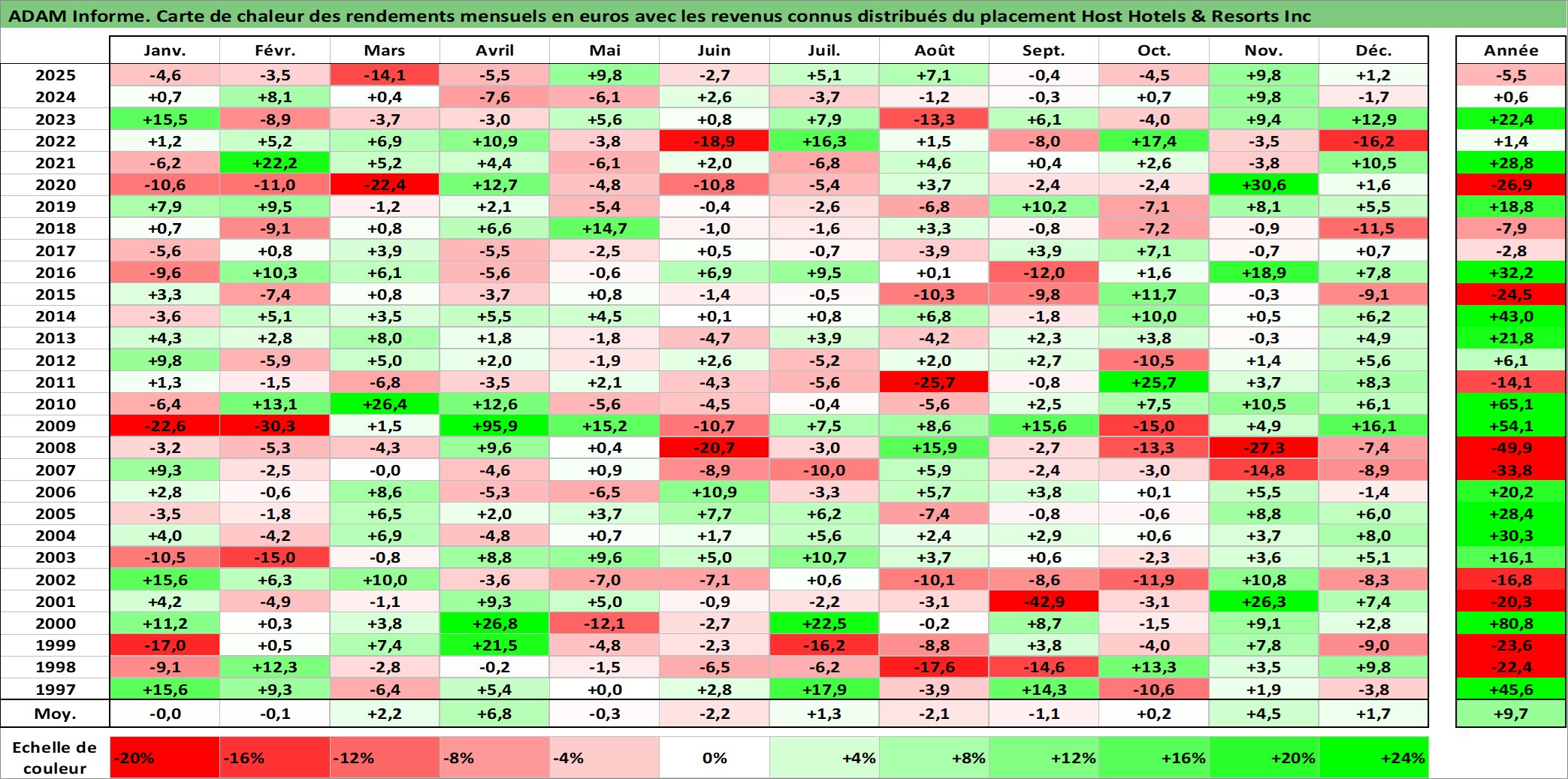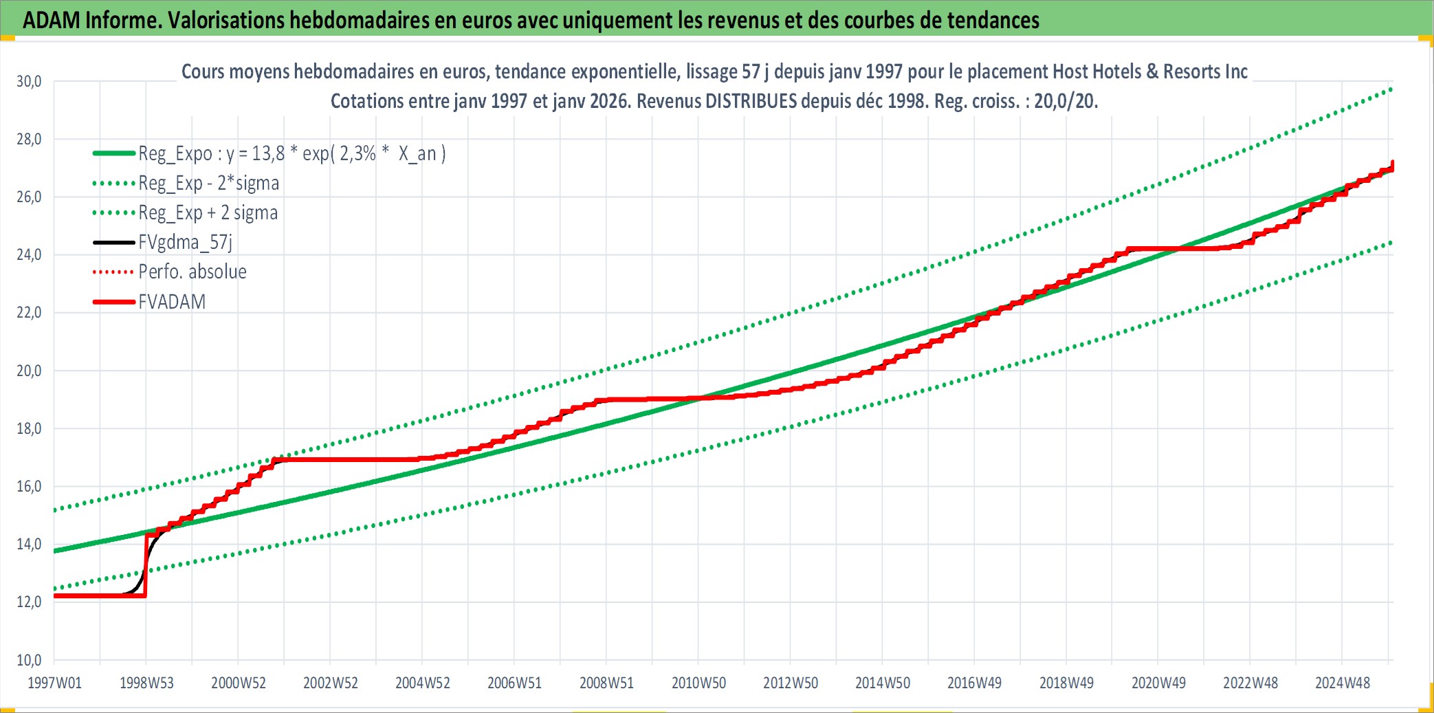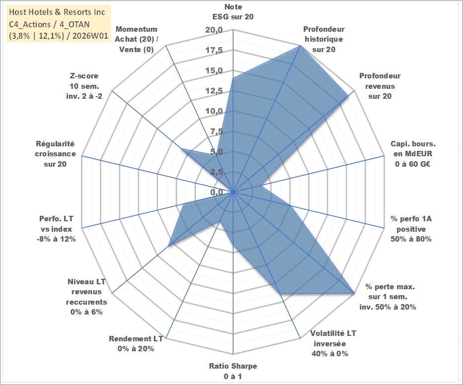 Site dédié aux investisseursPage dédiée sur site financeAnalyse des valorisations hebdomadaires de l'action Host Hotels & Resorts Inc. Cet actif est cote en USD. Les valorisations sont en contrevaleur EURO et couvrent les semaines 1997W01 a 2026W01. Les revenus de cet actif financier sont pris en compte depuis la semaine 1998W52. La note globale ESG de cet actif est estimee a 14.0 (apres rebasage entre 0 et 20).