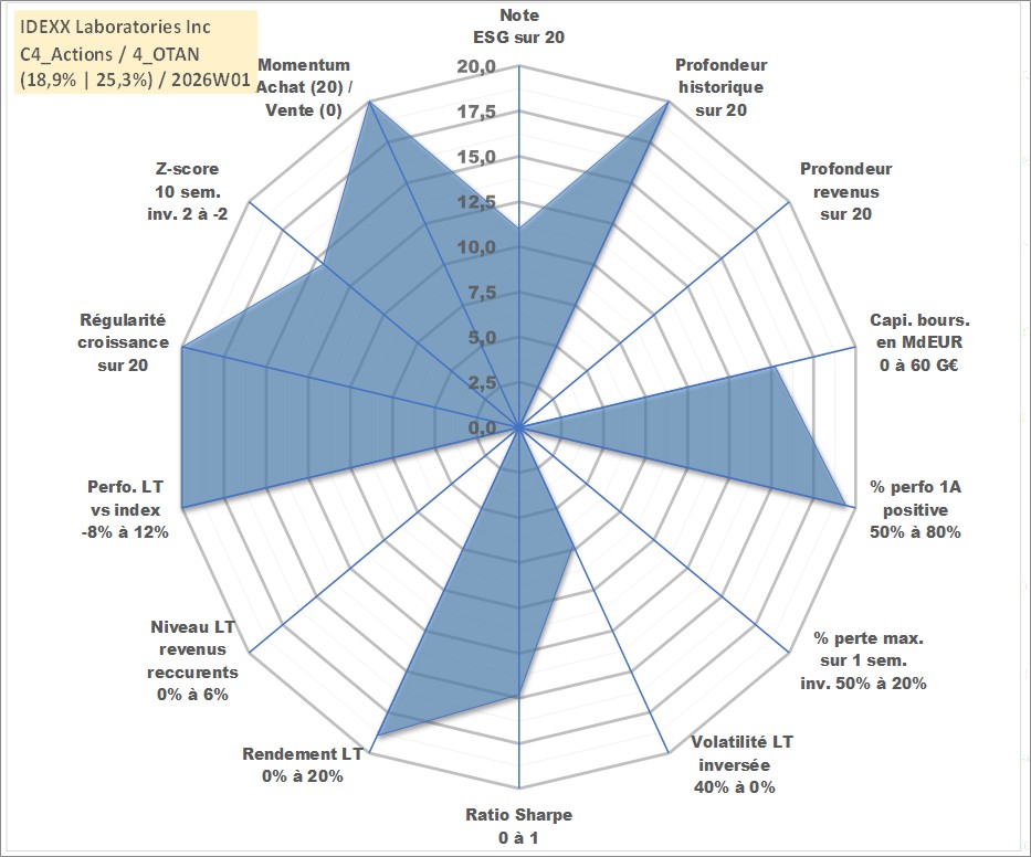 Site dédié aux investisseursPage dédiée sur site financeAnalyse des valorisations hebdomadaires de l'action IDEXX Laboratories Inc. Cet actif est cote en USD. Les valorisations sont en contrevaleur EURO et couvrent les semaines 1997W01 a 2026W01. Les revenus de cet actif financier ne sont pas connus car non existants ou non disponibles sur le site Yahoo Finance. La note globale ESG de cet actif est estimee a 11.0 (apres rebasage entre 0 et 20).