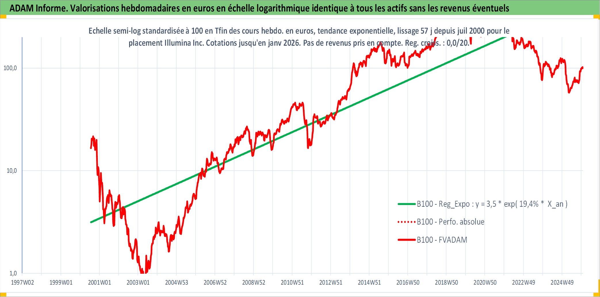 Site dédié aux investisseursPage dédiée sur site financeAnalyse des valorisations hebdomadaires de l'action Illumina Inc. Cet actif est cote en USD. Les valorisations sont en contrevaleur EURO et couvrent les semaines 2000W30 a 2026W01. Les revenus de cet actif financier ne sont pas connus car non existants ou non disponibles sur le site Yahoo Finance. La note globale ESG de cet actif est estimee a 16.0 (apres rebasage entre 0 et 20).