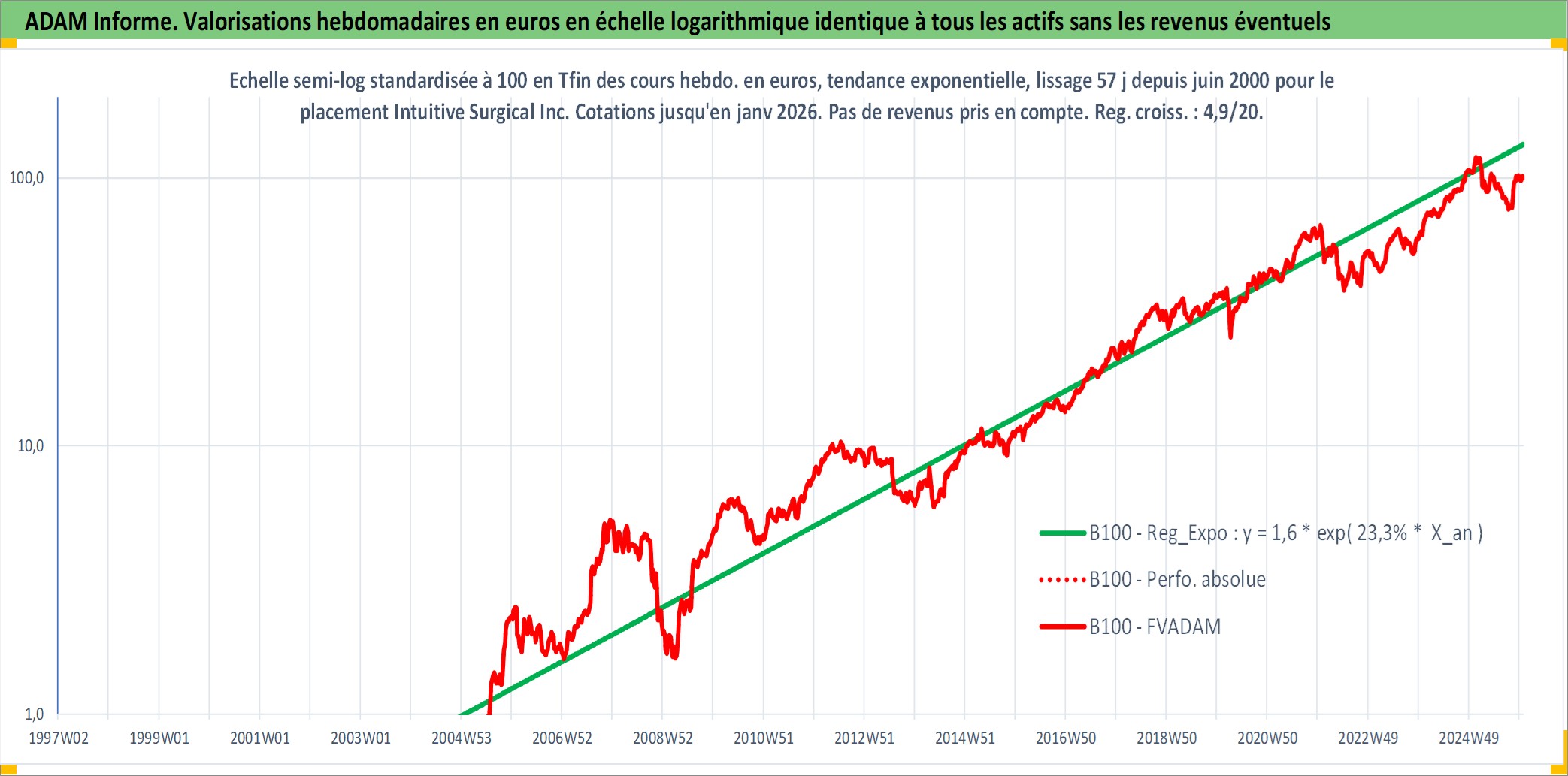 Site dédié aux investisseursPage dédiée sur site financeAnalyse des valorisations hebdomadaires de l'action Intuitive Surgical Inc. Cet actif est cote en USD. Les valorisations sont en contrevaleur EURO et couvrent les semaines 2000W24 a 2026W01. Les revenus de cet actif financier ne sont pas connus car non existants ou non disponibles sur le site Yahoo Finance. La note globale ESG de cet actif est estimee a 8.0 (apres rebasage entre 0 et 20).