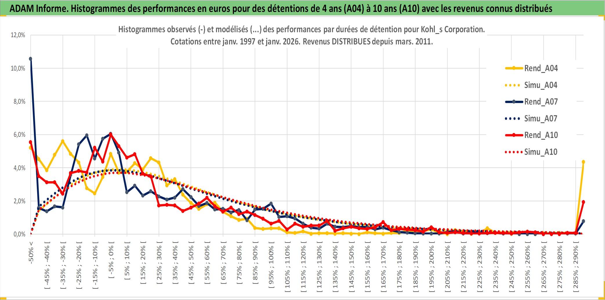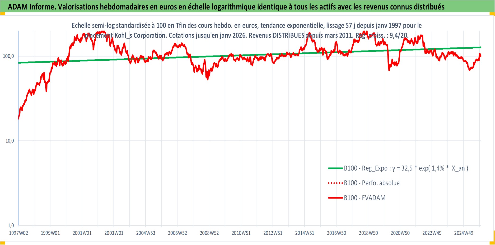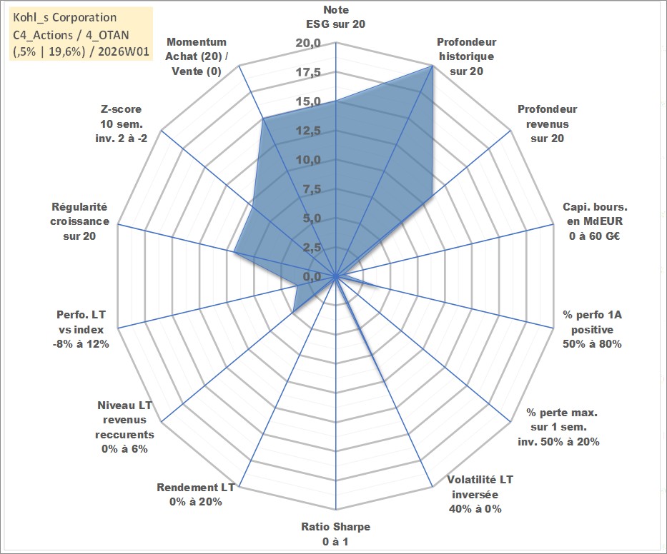 Site dédié aux investisseursPage dédiée sur site financeAnalyse des valorisations hebdomadaires de l'action Kohl_s Corporation. Cet actif est cote en USD. Les valorisations sont en contrevaleur EURO et couvrent les semaines 1997W01 a 2026W01. Les revenus de cet actif financier sont pris en compte depuis la semaine 2011W10. La note globale ESG de cet actif est estimee a 15.0 (apres rebasage entre 0 et 20).