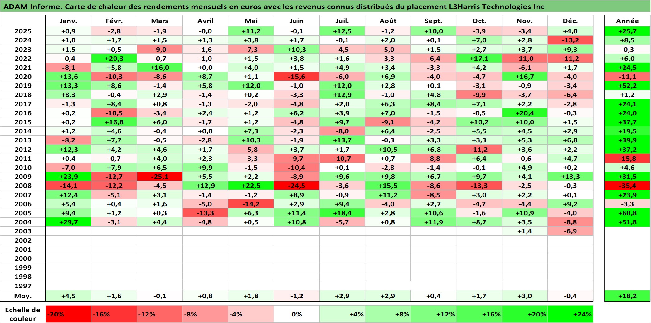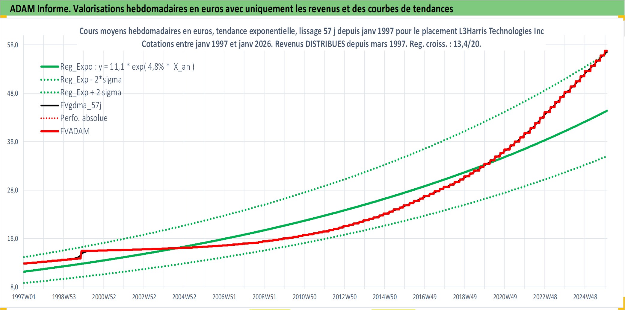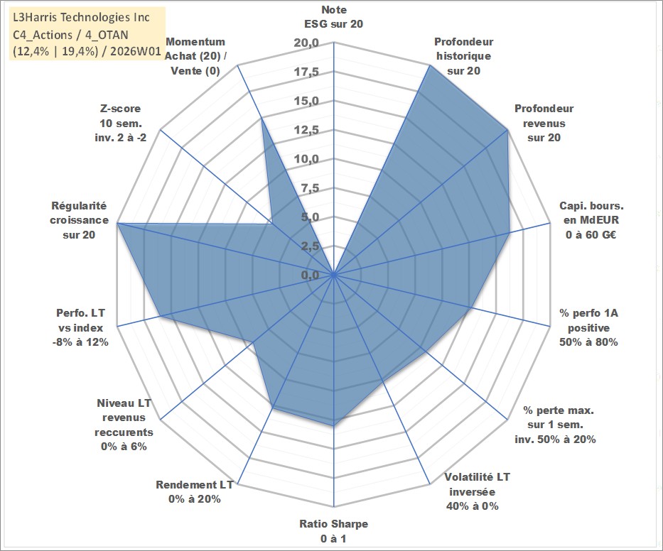 Site dédié aux investisseursPage dédiée sur site financeAnalyse des valorisations hebdomadaires de l'action L3Harris Technologies Inc. Cet actif est cote en USD. Les valorisations sont en contrevaleur EURO et couvrent les semaines 1997W01 a 2026W01. Les revenus de cet actif financier sont pris en compte depuis la semaine 1997W10. La note ESG de cet actif n'est pas connue.