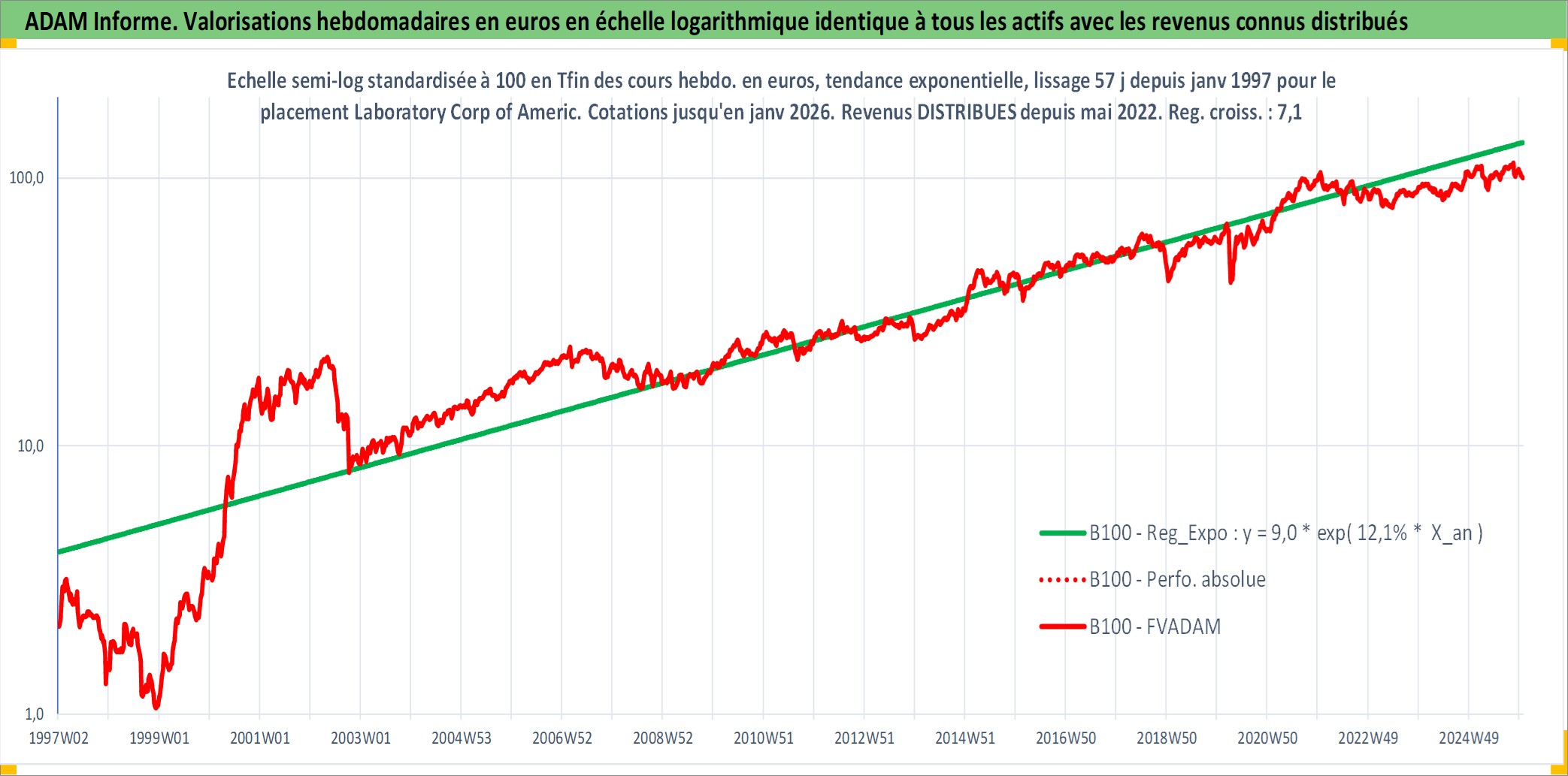Site dédié aux investisseursPage dédiée sur site financeAnalyse des valorisations hebdomadaires de l'action Laboratory Corp of America Holdings. Cet actif est cote en USD. Les valorisations sont en contrevaleur EURO et couvrent les semaines 1997W01 a 2026W01. Les revenus de cet actif financier sont pris en compte depuis la semaine 2022W20. La note globale ESG de cet actif est estimee a 11.0 (apres rebasage entre 0 et 20).