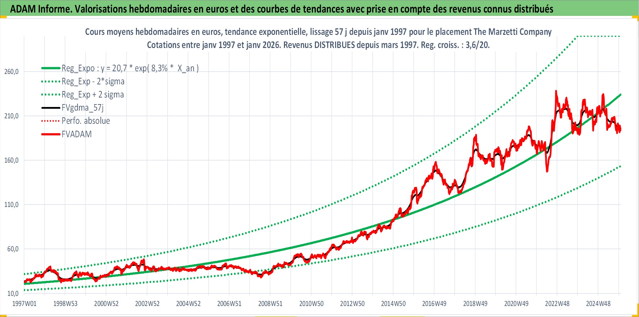 Site dédié aux investisseursPage dédiée sur site financeAnalyse des valorisations hebdomadaires de l'action The Marzetti Company. Cet actif est cote en USD. Les valorisations sont en contrevaleur EURO et couvrent les semaines 1997W01 a 2026W01. Les revenus de cet actif financier sont pris en compte depuis la semaine 1997W10. La note ESG de cet actif n'est pas connue.